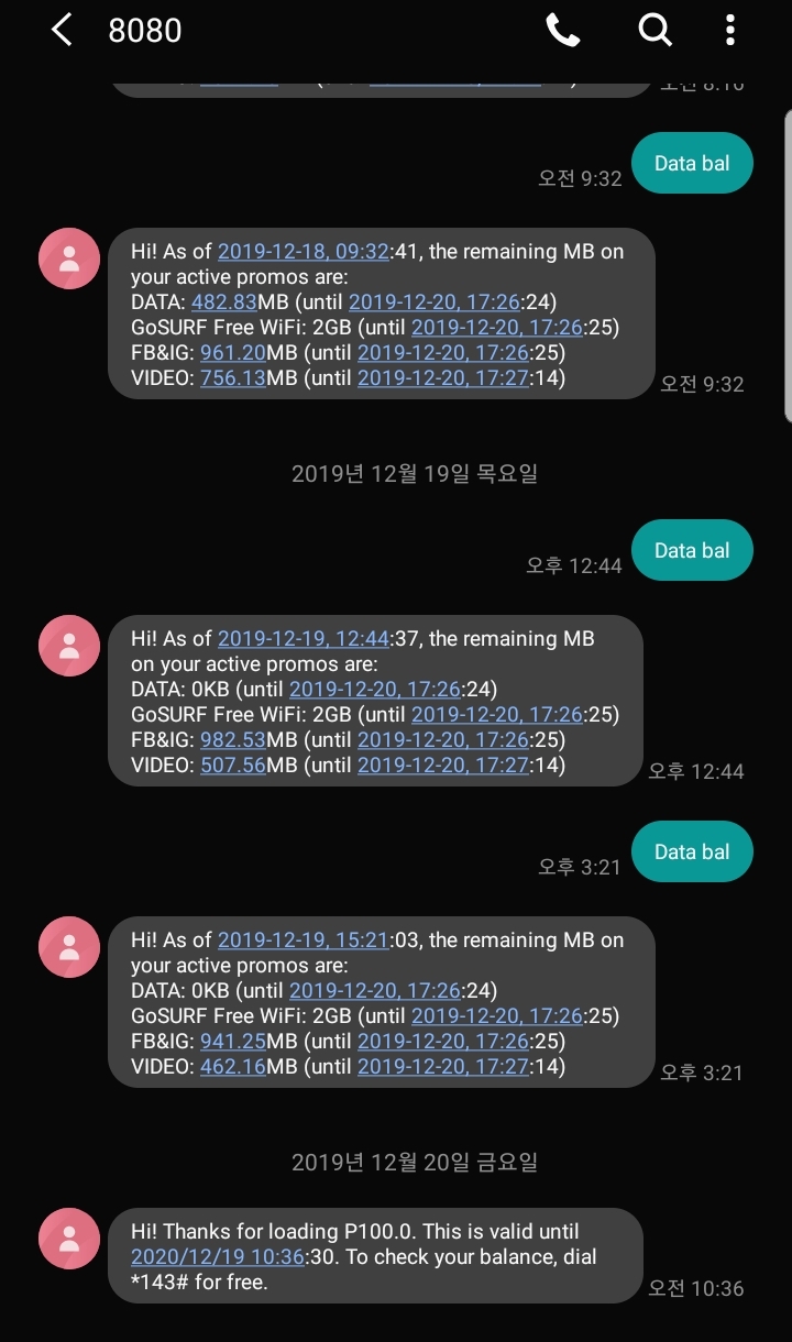 이렇게 하면 날짜와 함께 100페소가 충전됐다고 뜬다.