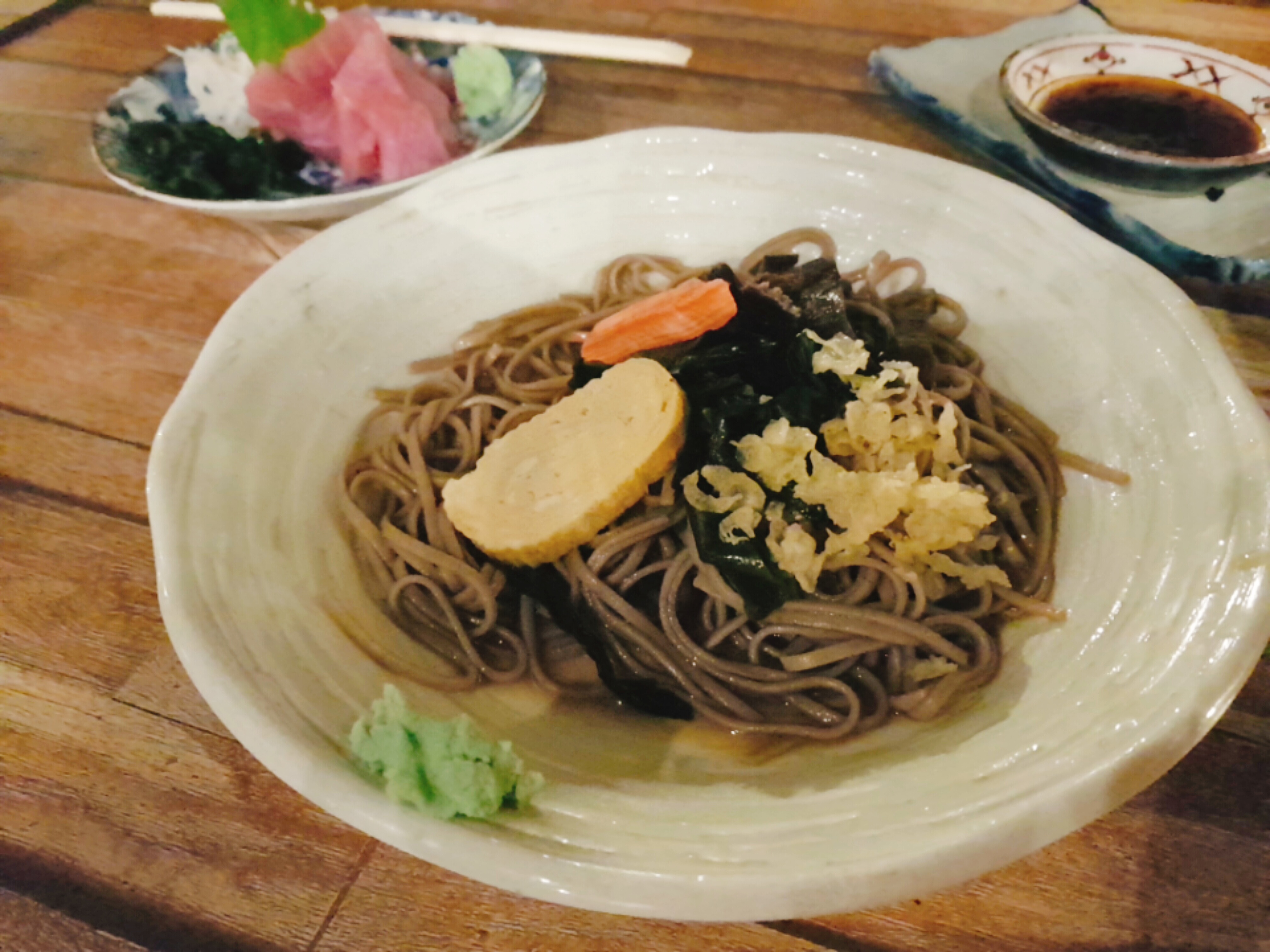 저녁시간 지나고 늦게 와서 그런지 주문 가능한 메뉴가 몇 개 없었다. 원래는 사시미 메뉴에 나나텐 모리를 시켜먹으려고 했는데 이것도 품절.. 가능한 사시미 하나와 소바 하나 그리고 군만두까지!