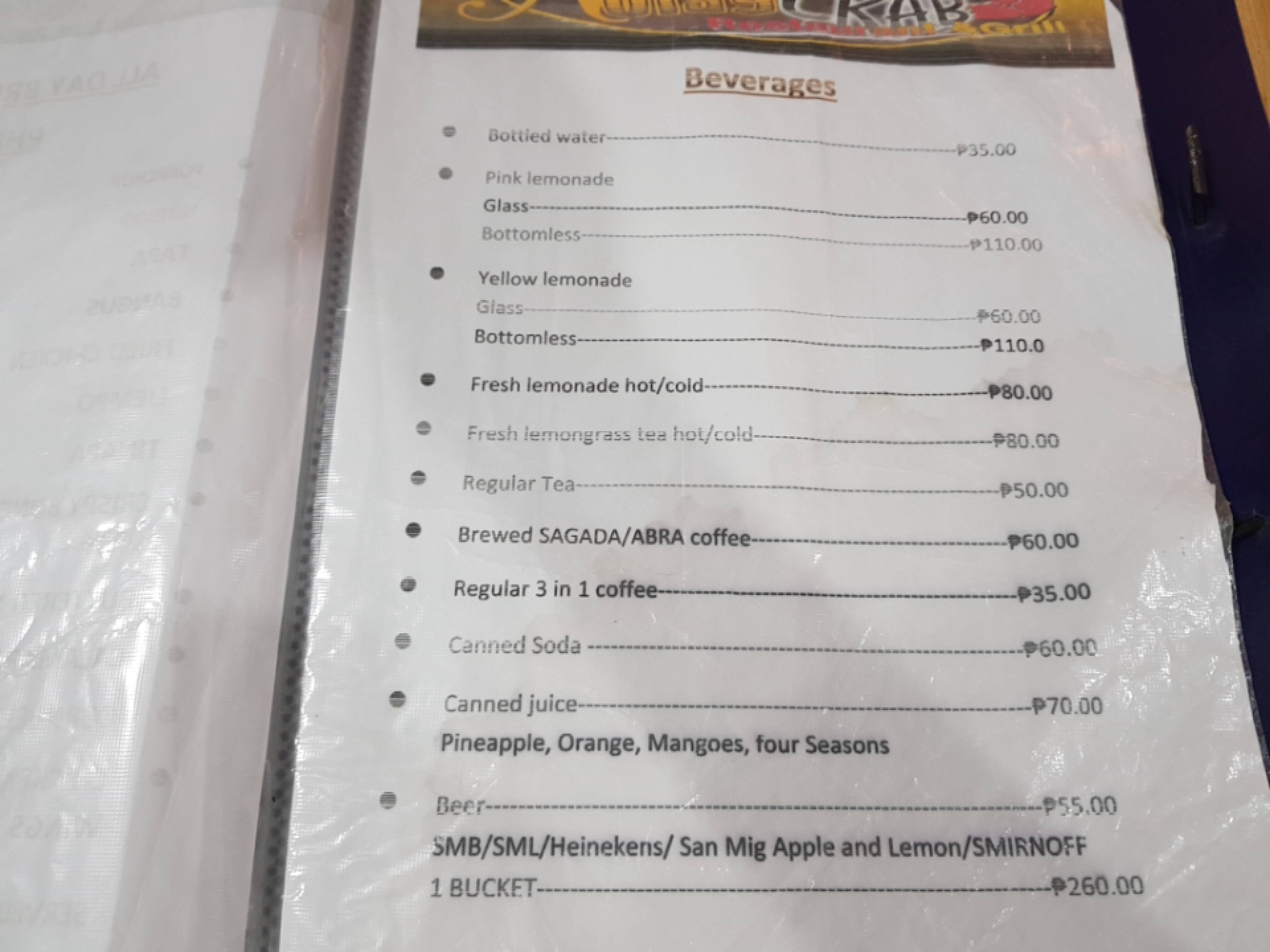 메뉴에는 무제한 크랩과 새우도 있었으나 그다지 여기서 허기를 달래고 다른 곳도 가기로 해서 SEAFOOD PLATTER 메뉴의 CRAB & CREW for 4 persons 999페소, 맥주까지 주문!