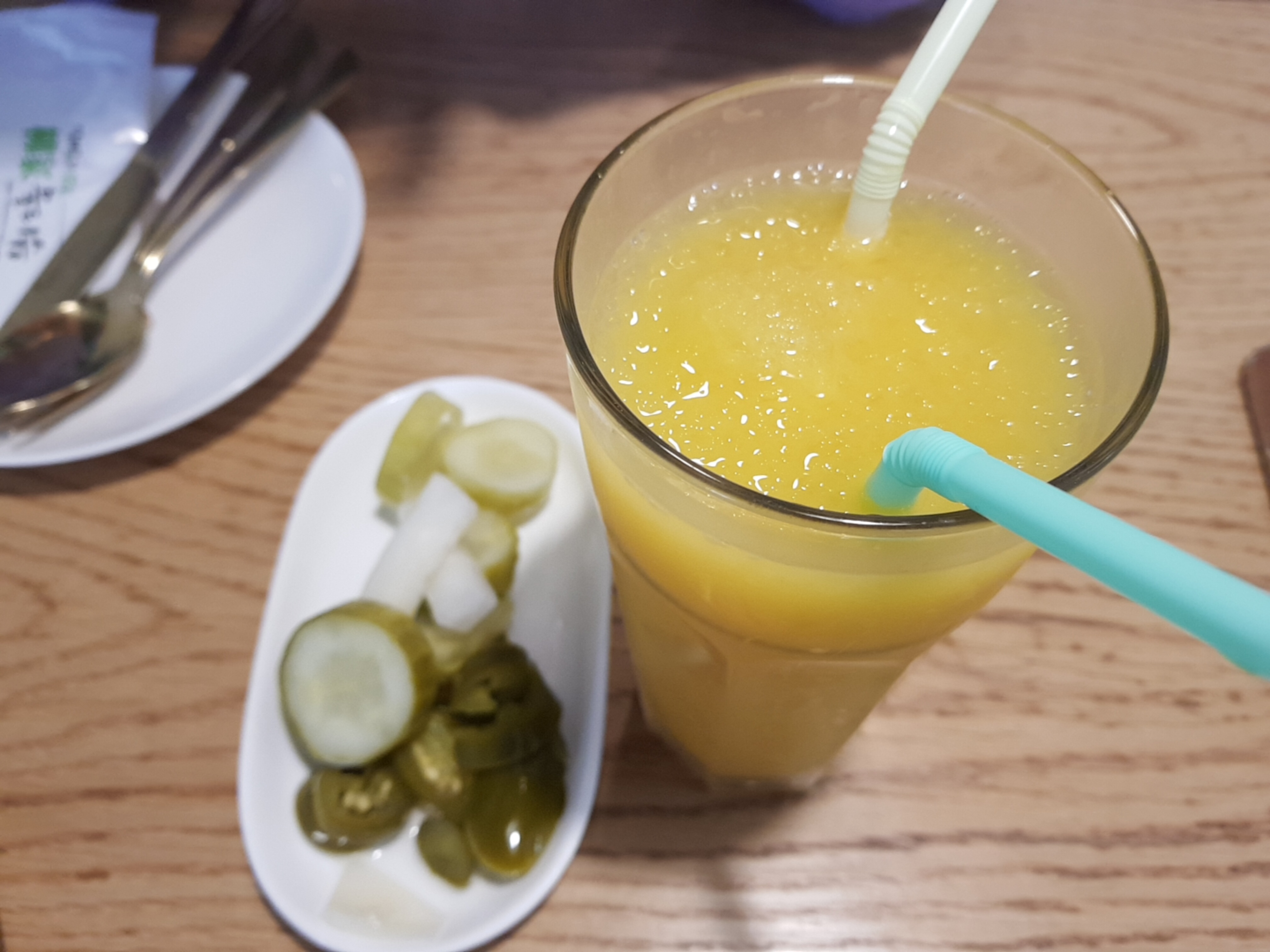 좋아보이는 자리는 이미 손님이 있었고 우린 안쪽으로~ 알고보니 화장실 들어가는 입구라서 사람들이 왔다갔다했다. : ( 사람들이 앉지 않는곳은 이유가 있다. 피클인줄알고 먹었던 고추.. 많이 맵다.