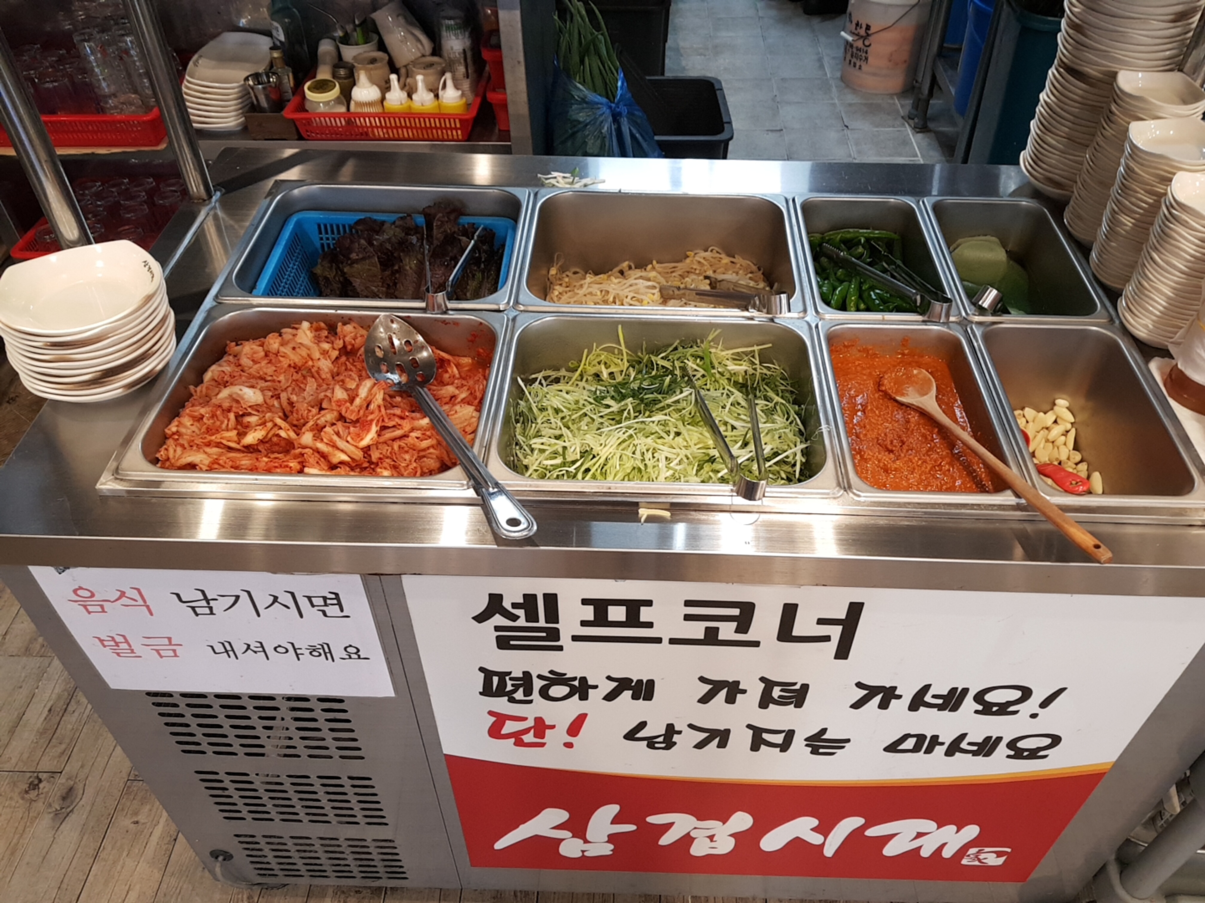 주방 앞쪽에 있는 셀프코너! 난 개인적으로 셀프코너 있는 곳이 좋다. 직원을 부르지않고 그냥 다녀오는게 훨씬 더 맘이 편하기 때문! 대신 먹을만큼만 가져가자. 내 최애 파절이만 리필리필~
