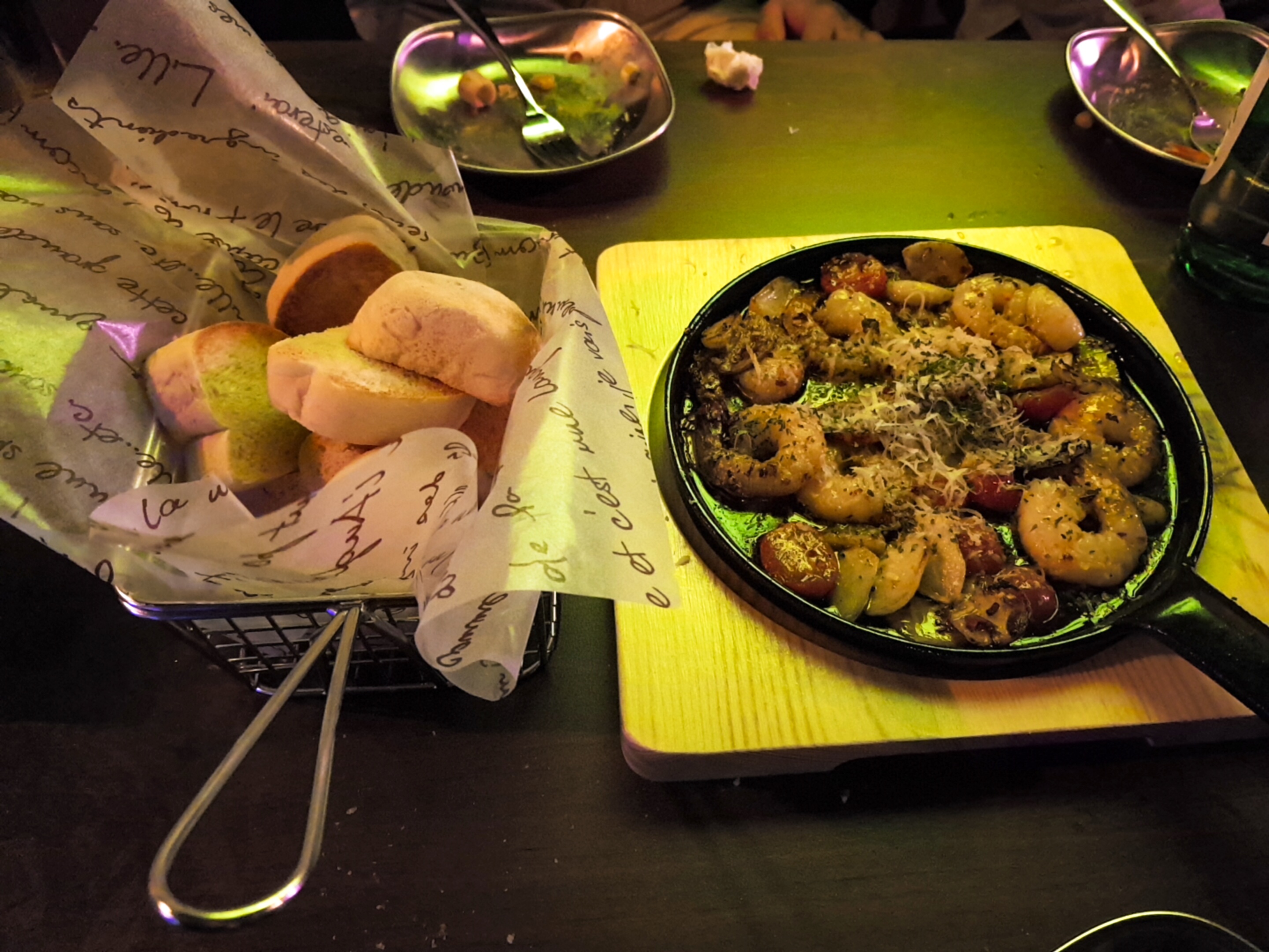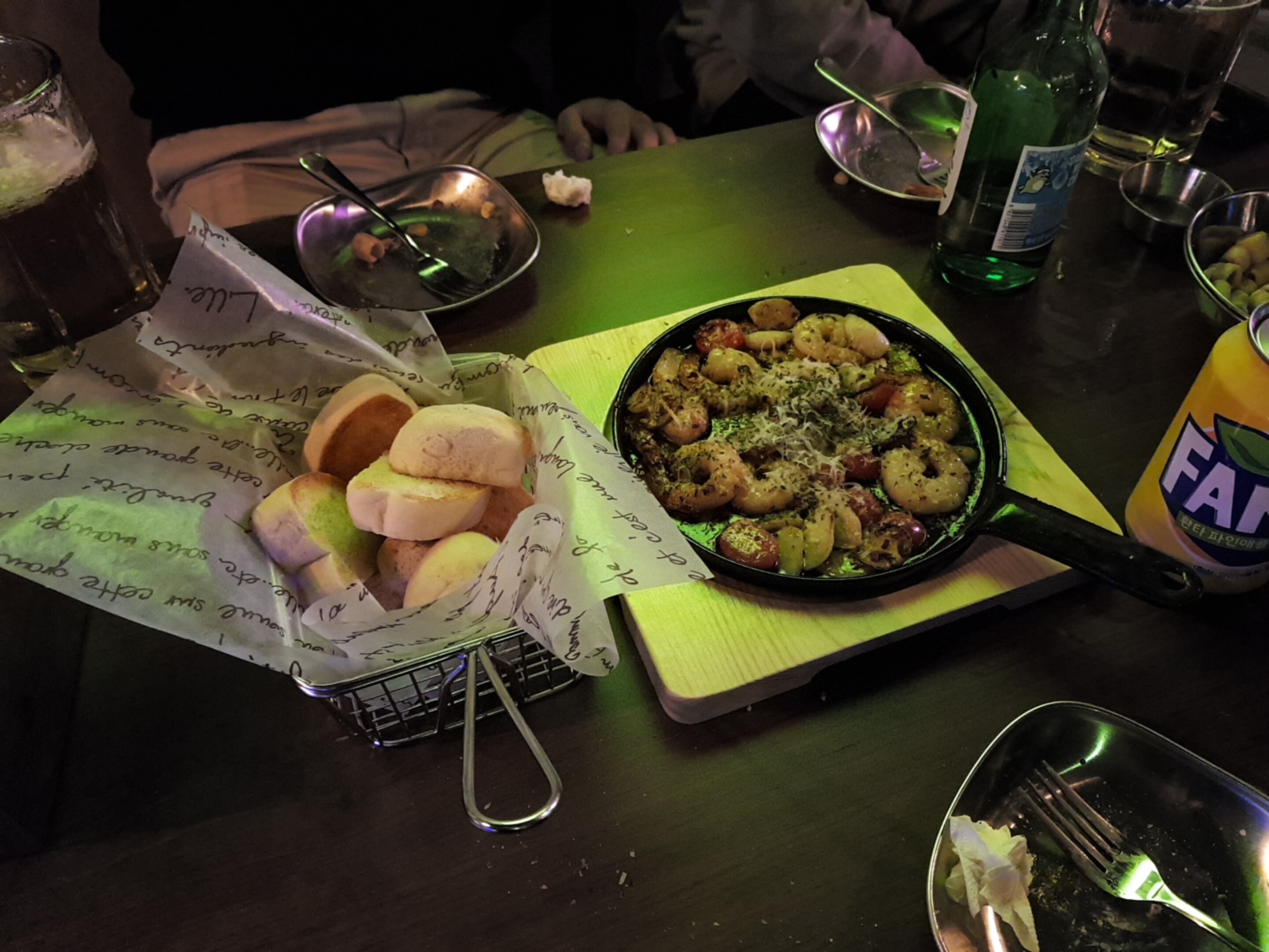 자리를 잡고 앉기 무섭게 맥주 네잔부터 주문! 기본 손가락 과자가 이렇게 나온다. 메뉴는 바질 쉬림프 피자 12,0 과 감바스 12,0 으로 시켰다. 이날 이후에도 자주 다녀왔기때문에 자신있게 맛있다고 추천하는 메뉴는 벨지안 감자튀김, 닭껍질 튀김, 짜장 라볶이, 그리고 아이스 포도가 되겠다! 옆 테이블에서 아이스 포도를 보곤 맛있겠다며 메뉴가 뭔지 물어봤을정도!