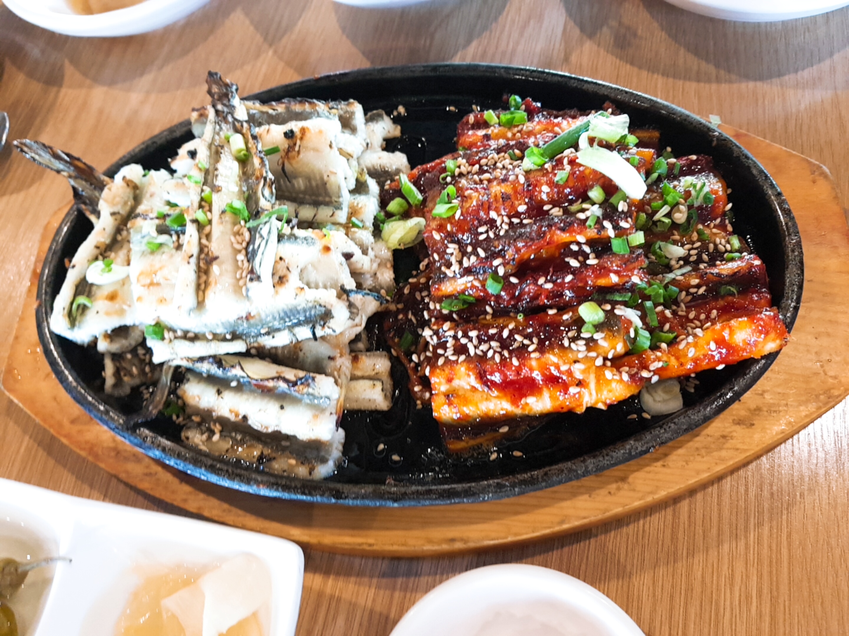 우리가 주문한 반반 장어 도착! 양념반, 소금구이 반? 개인적으로 양념구이가 참 맛있다. 비주얼 보면 맛없을 수 없는 비주얼이다. 셀프바에서 가져온 채소들이랑 싸먹으면 찰떡! 메뉴에 장어 국밥과 장어 국수도 있는데 장어구이 먹으면서 밥이랑 같이 먹으면 힘이 불끈불끈쓰ㅋㅋ 전에 와본 곳이라고 메뉴판 찍는것도 깜빡했다.