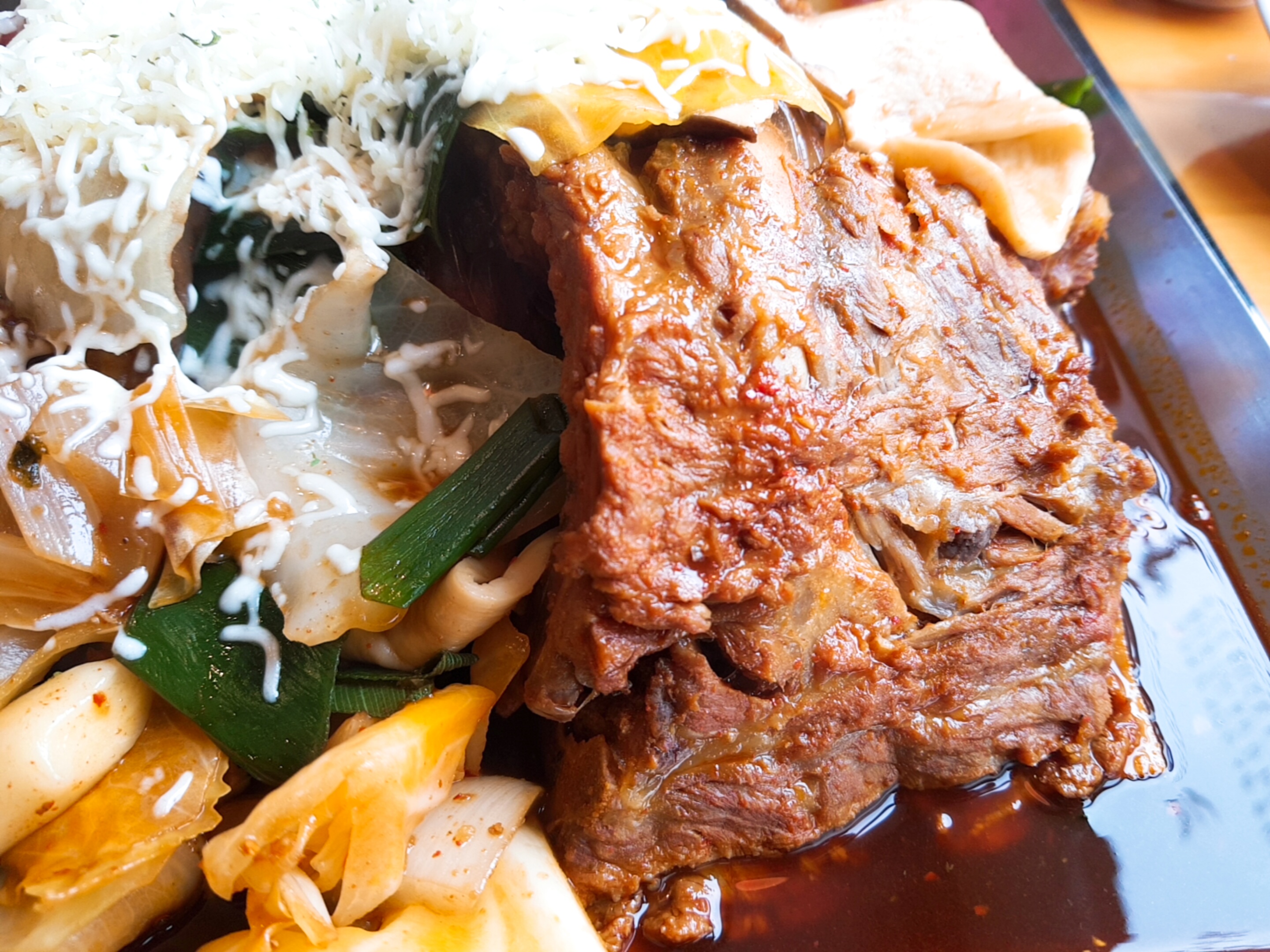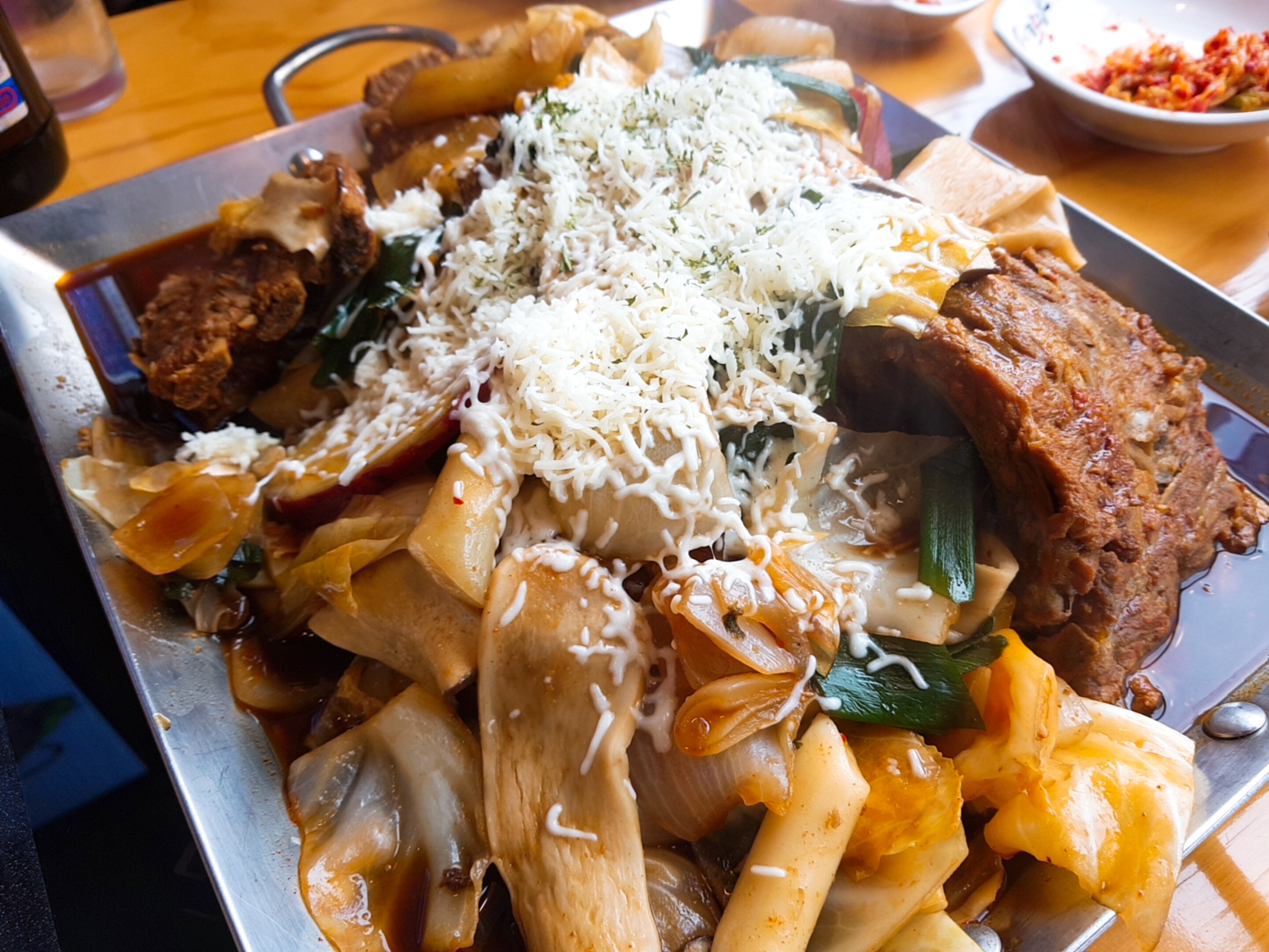 드디어 나온 메인메뉴! 철판 뼈찜 되시겠다. 사실 시킬때는 위에 치즈가 이렇게 올라가있는줄 몰랐는데 ㅎㅎ 맵기를 보통 맛으로 시켰어도 괜찮았을듯하다. 치즈가 매운 맛을 조금 잡아주기때문에 매콤하게 먹는것도 낫 배드~