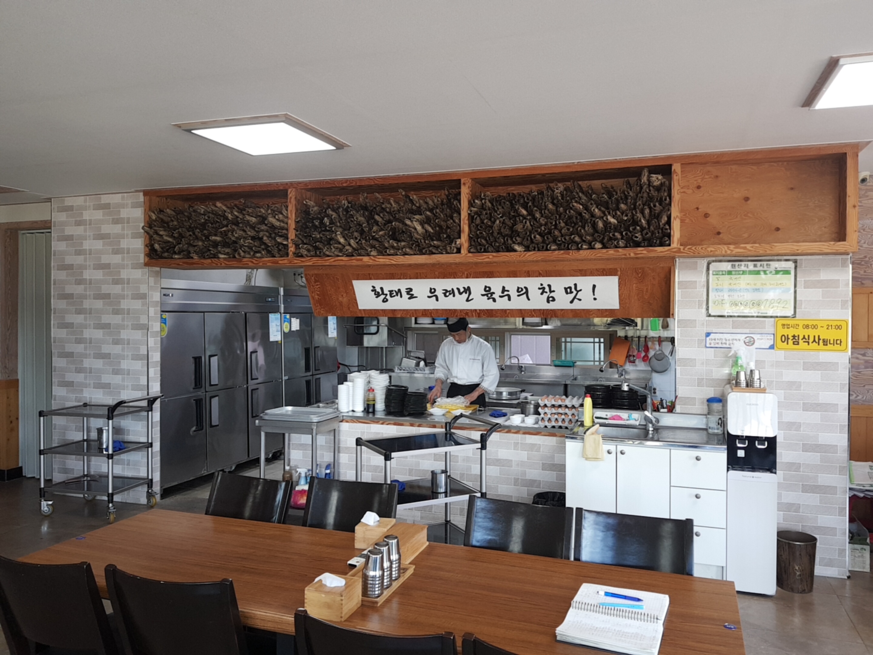 쪼~금 이른 점심시간이었는데 우리가 일등! 국밥이 나오기도전에 네팀이 들어왔다. 주변 공장에서 일하시는분들이 특히 많이오는듯했다. 이 집의 주메뉴는 황태가 들어간 콩나물 국밥! 매운걸 잘 못먹는 나한테는 조금 매콤했지만 술 먹고 해장하러오면 진짜 제격이겠다는 생각이 바로 들었다. 선반에 촘촘히 보이는 것들이 다 황태란말씀! 실제로보면 조금 기괴..ㅋㅋㅋㅋㅋㅋㅋ