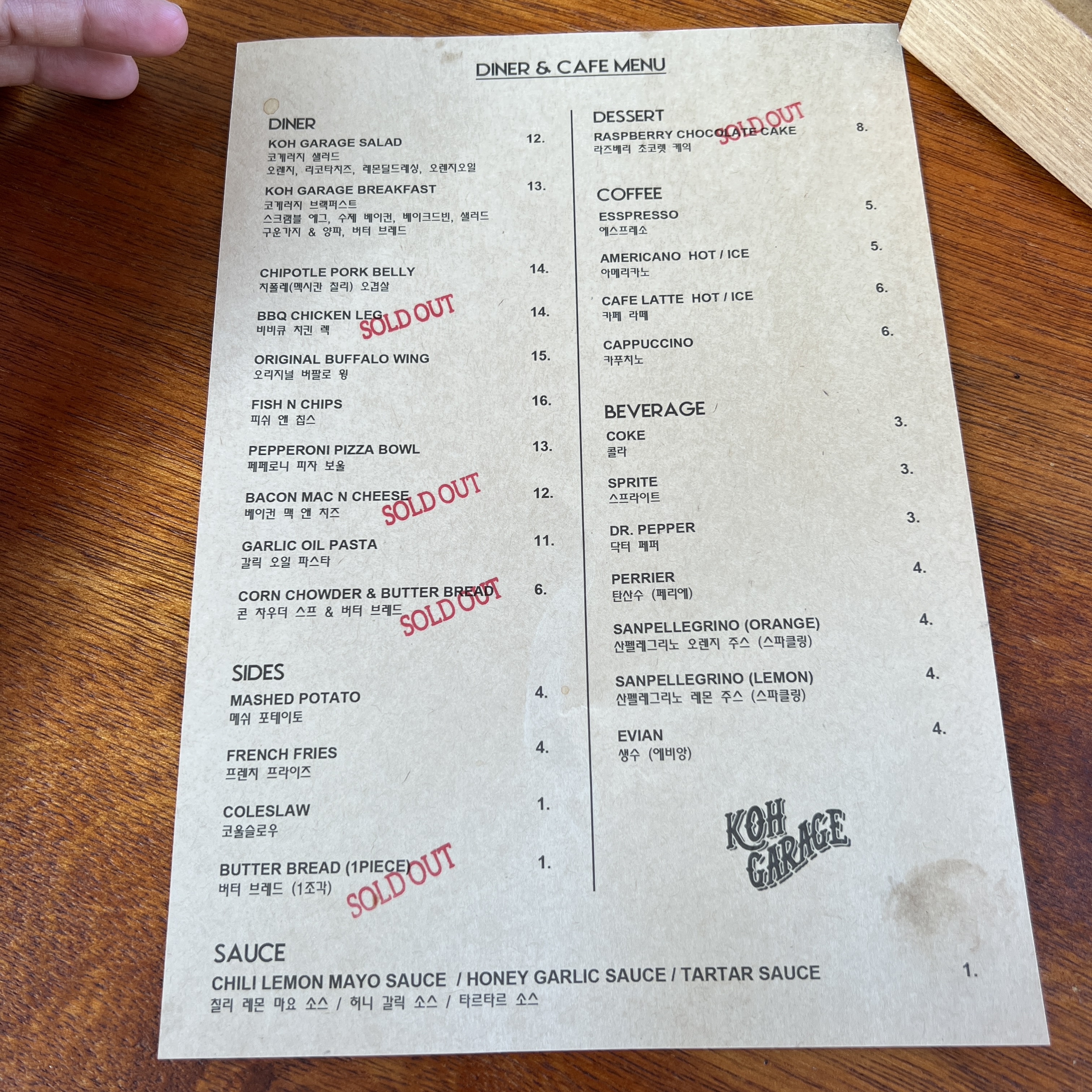 식사를 하고 왔지만 먹어보고싶었던 KOH GARAGE BREAKFAST 를 주문하고 음료도 두잔 주문했다.