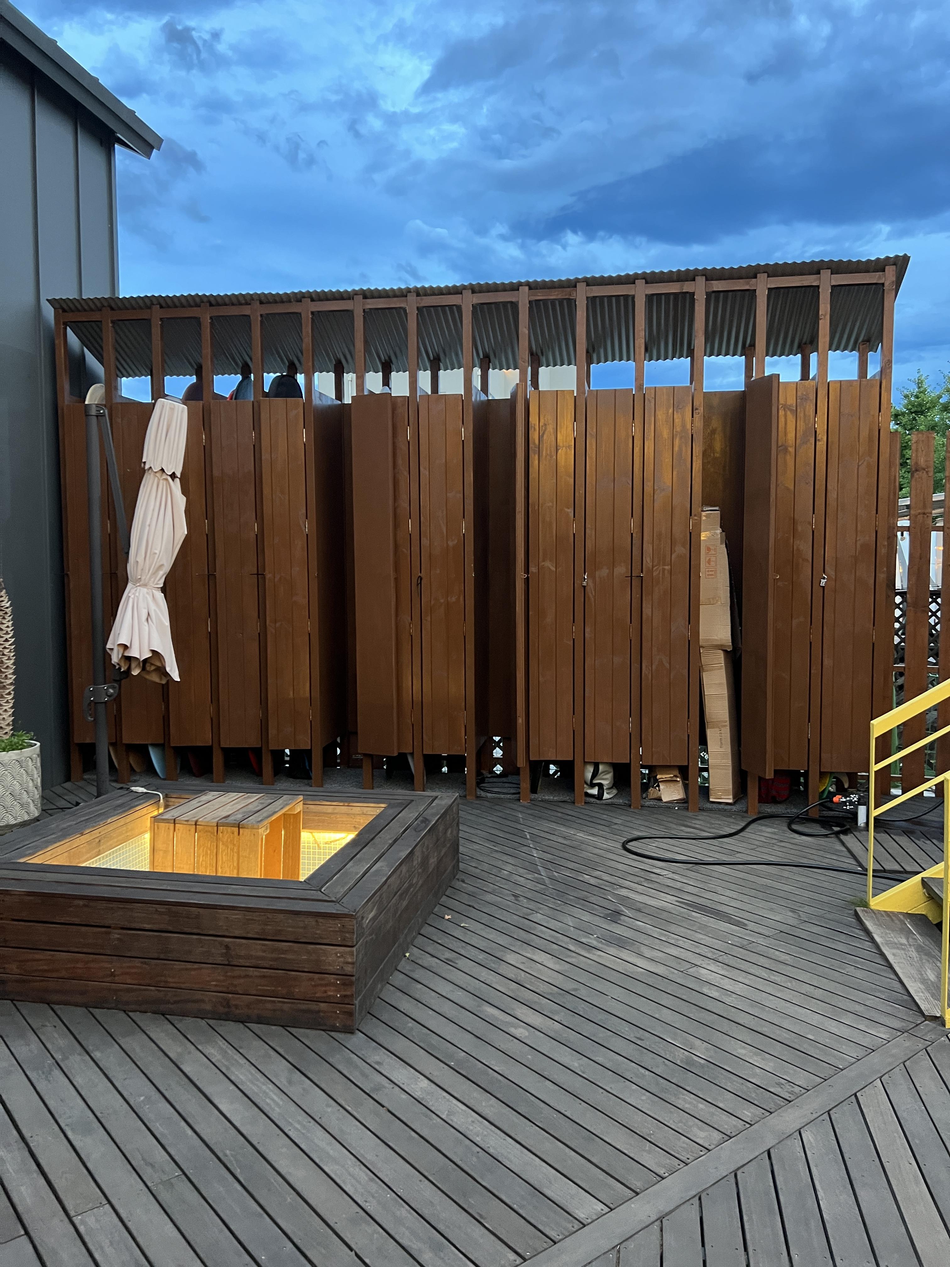 싱글핀 서프웍스의 보드 보관함과 샤워실이 있었다.
