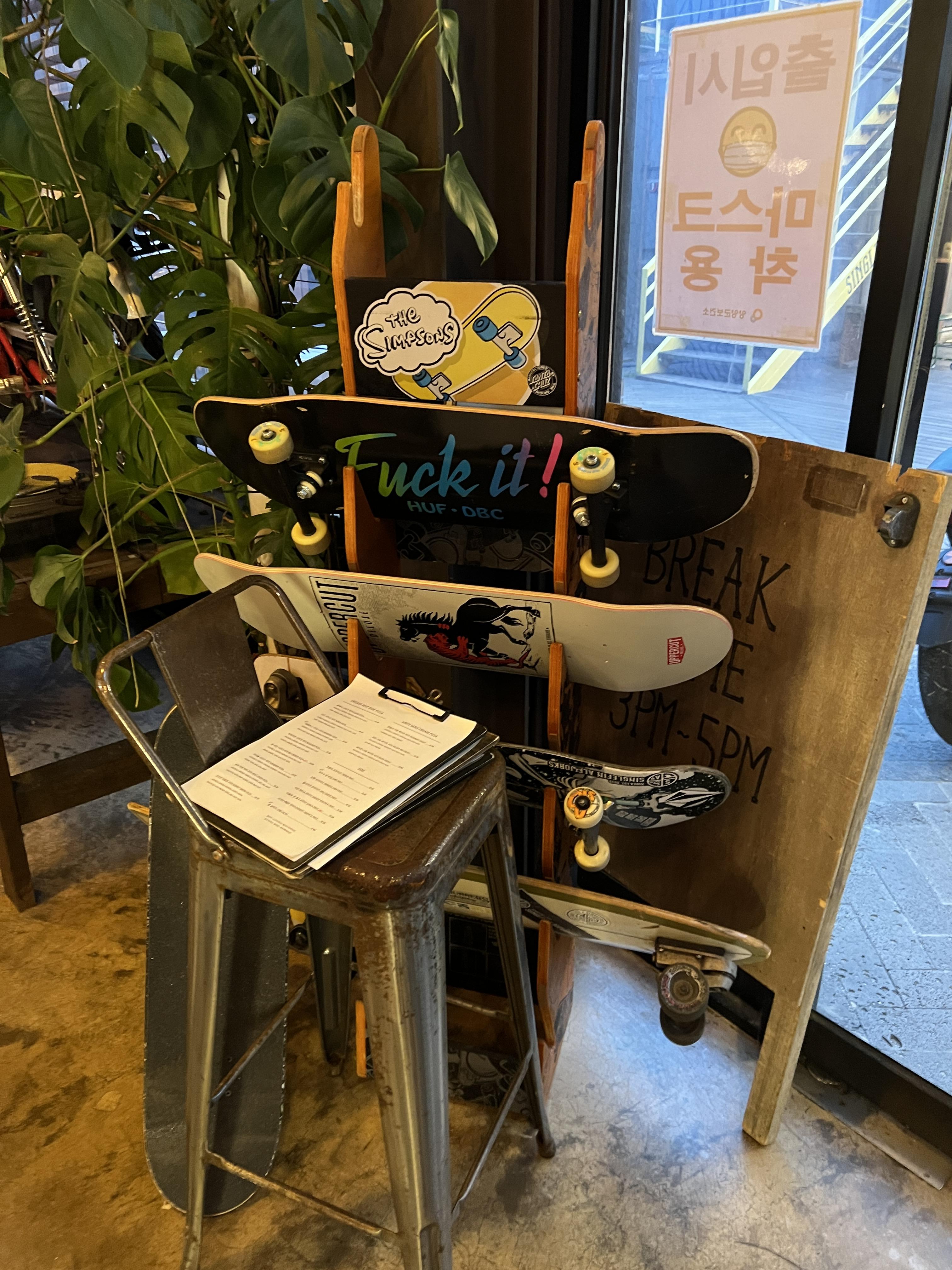 입구 바로 앞에 여러 종류의 스케이트보드와