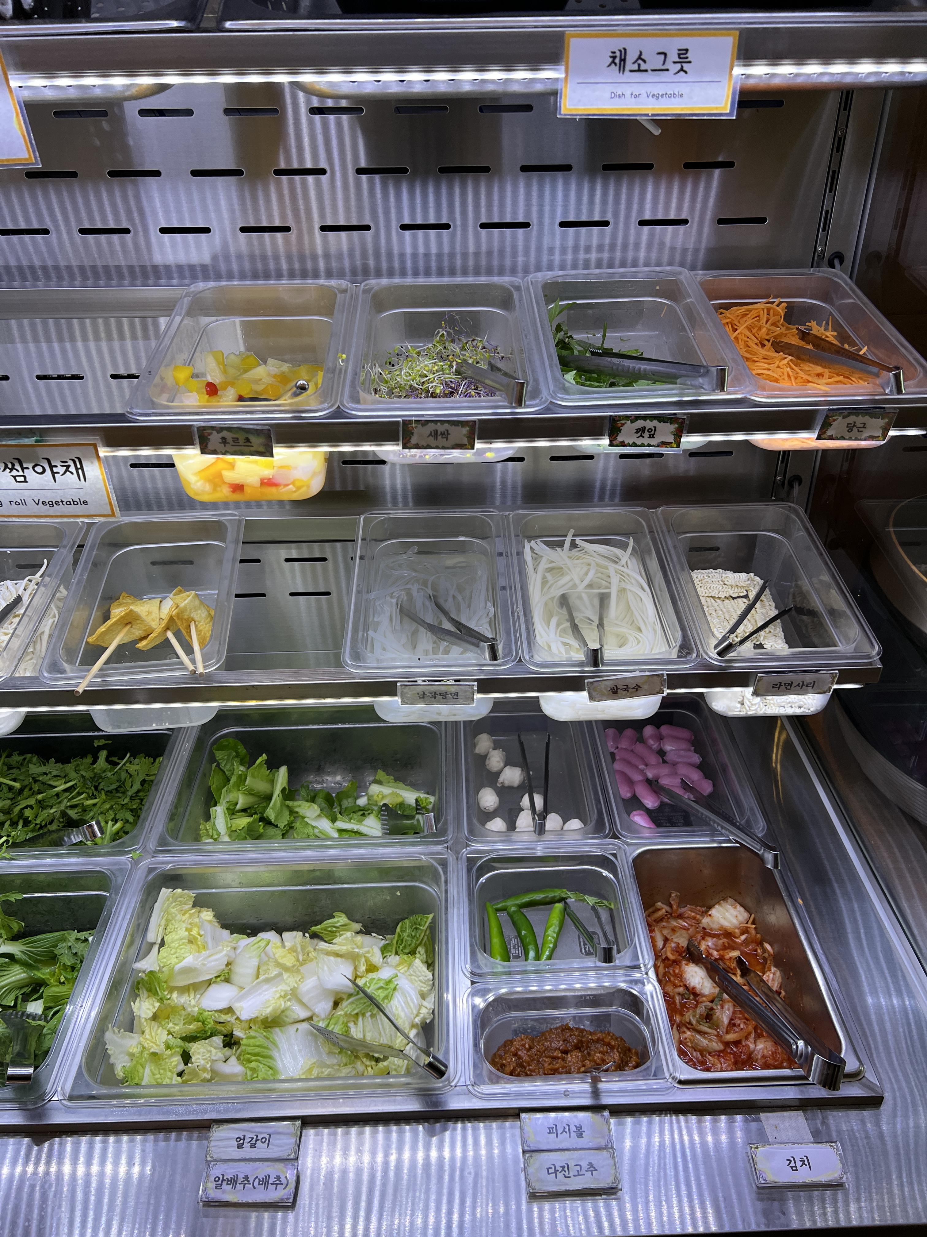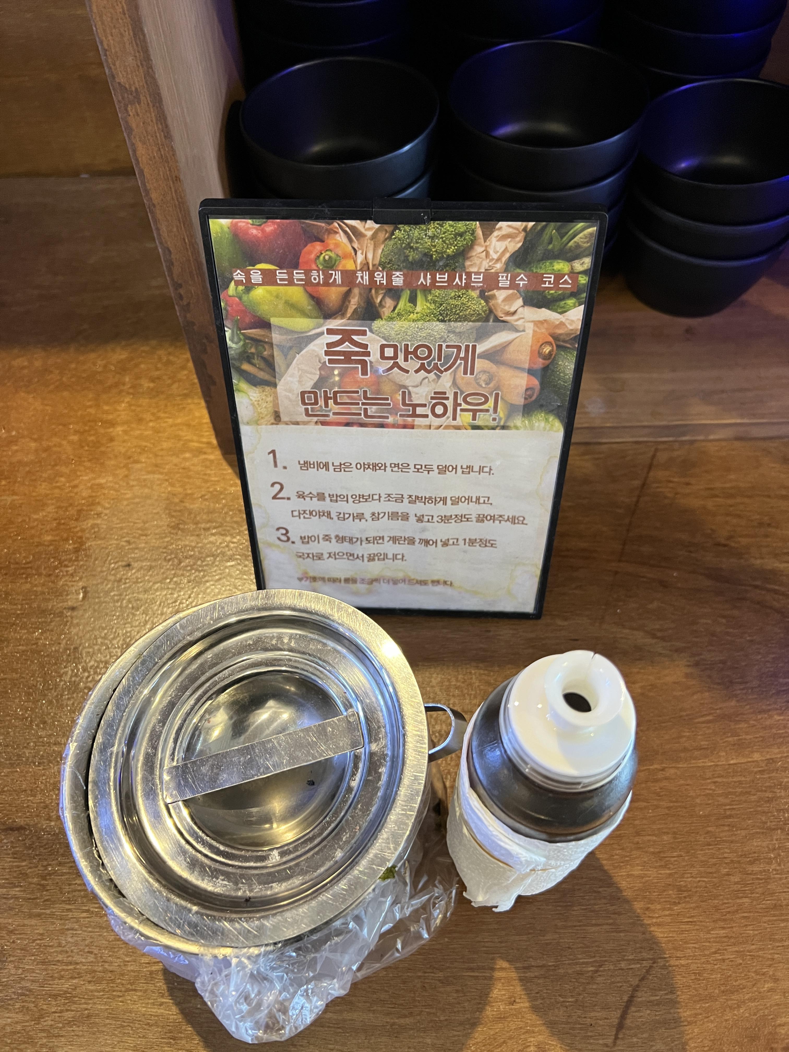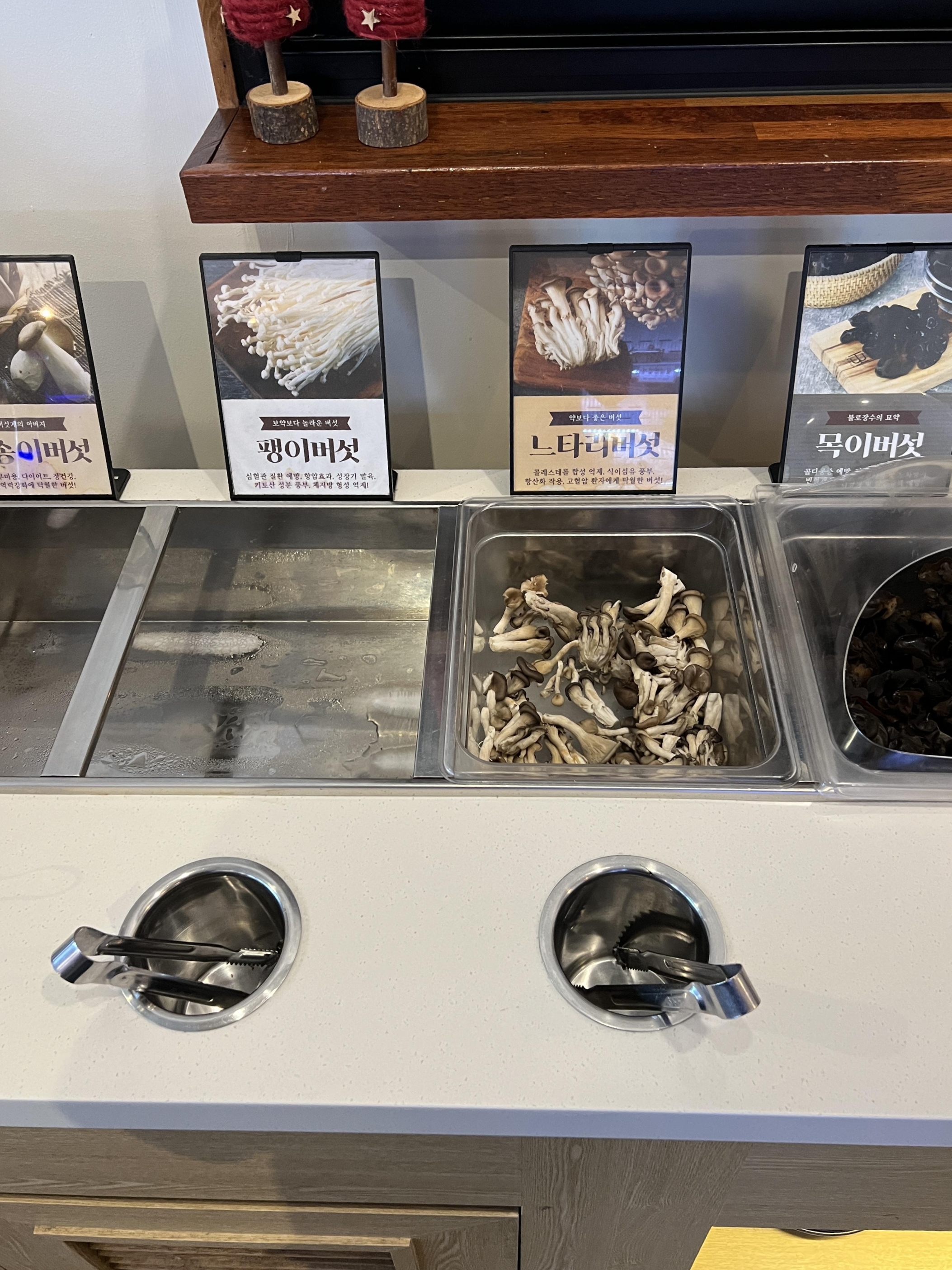 실내로 들어와서 자리잡으면 맛있게 먹을 수 있게끔 직원분들이 상을 세팅해주시는데 그새를 못참고 우리는 샤브샤브에 들어갈 채소들 챙기러 고고!