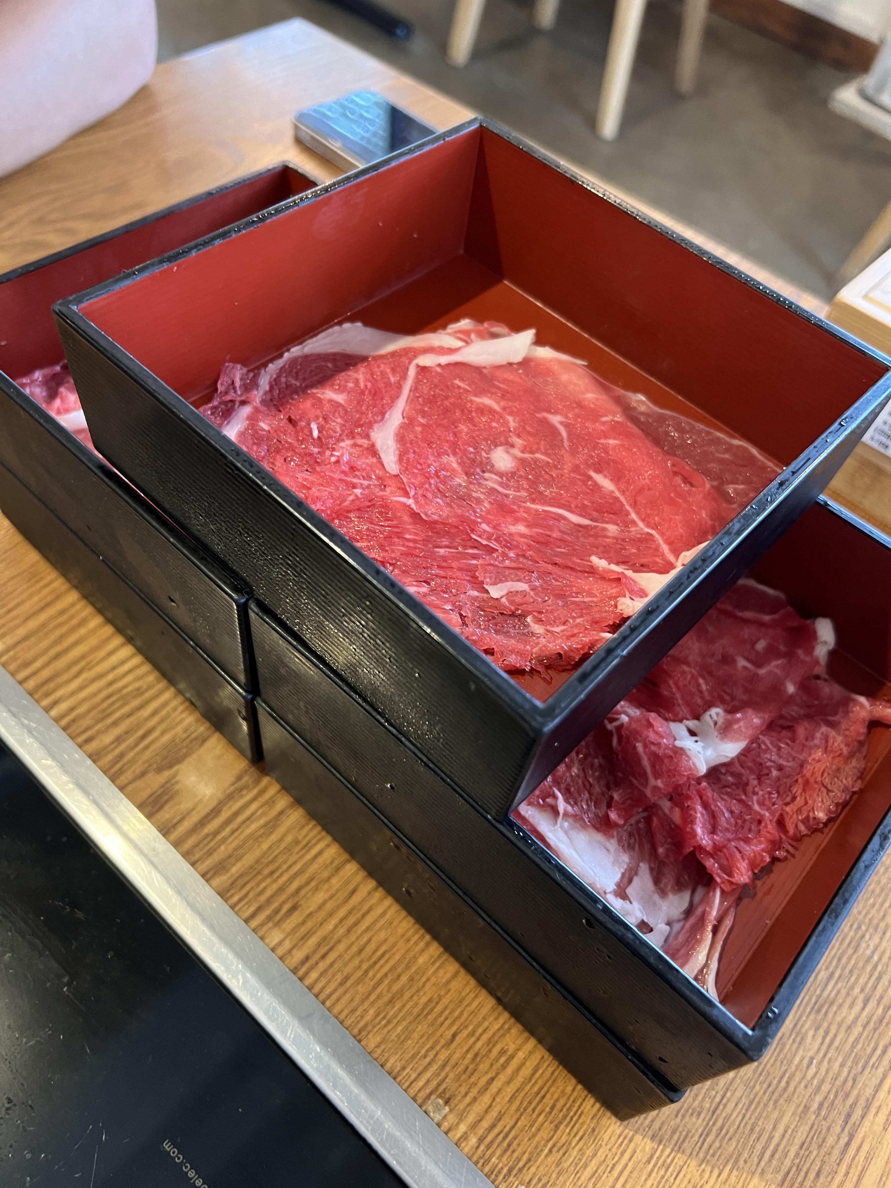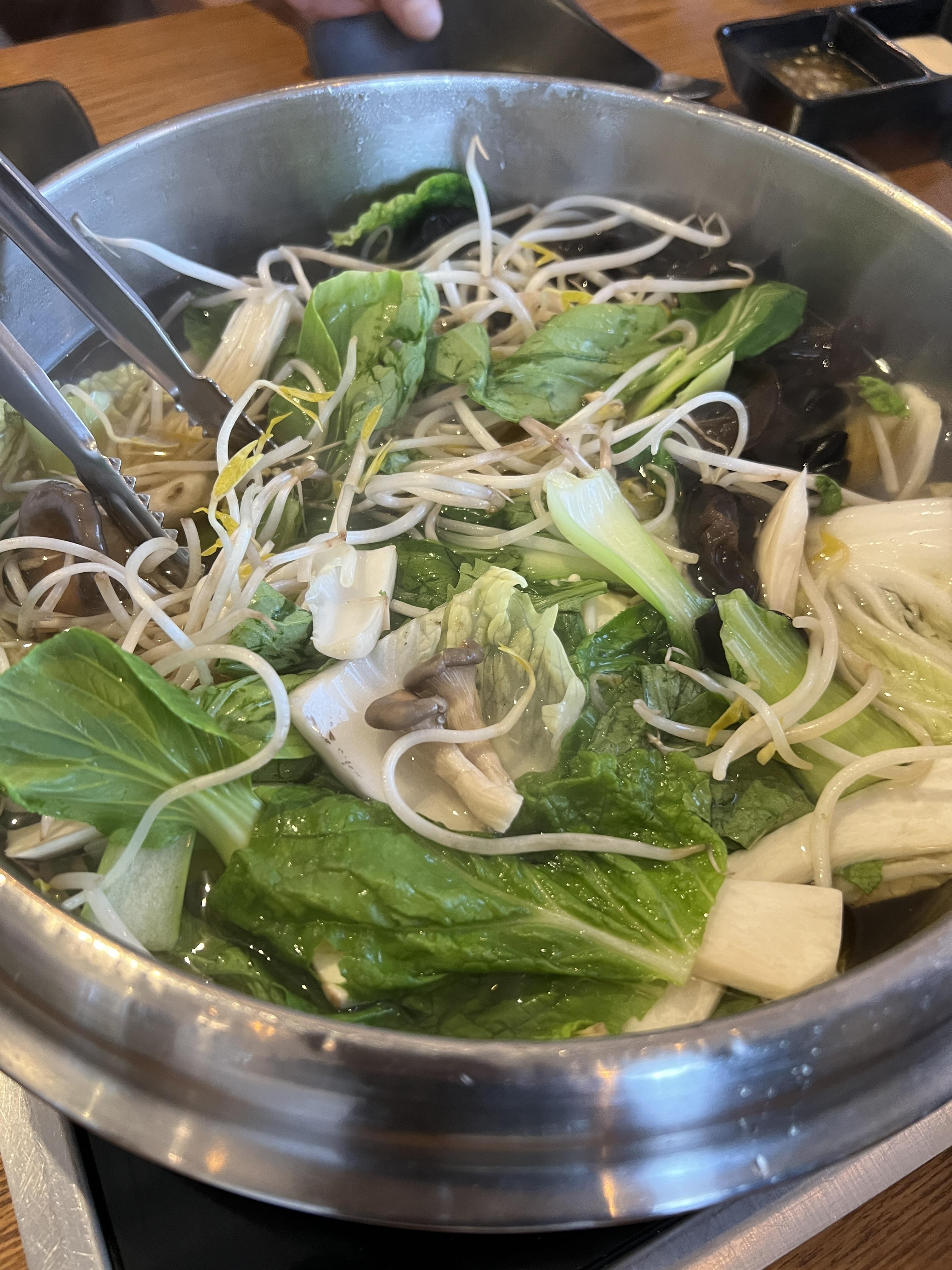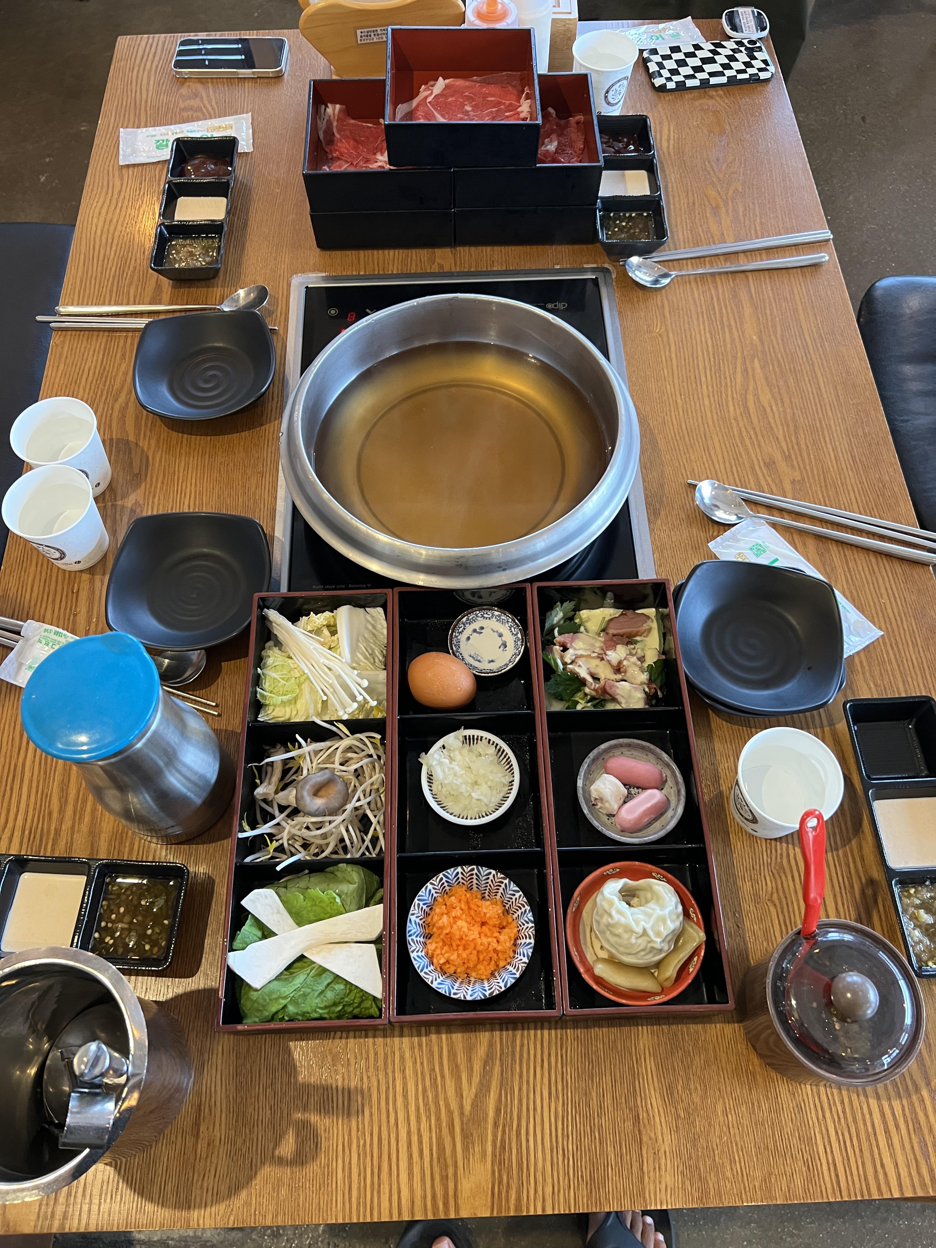 실내로 들어와서 자리잡으면 맛있게 먹을 수 있게끔 직원분들이 상을 세팅해주시는데 그새를 못참고 우리는 샤브샤브에 들어갈 채소들 챙기러 고고!