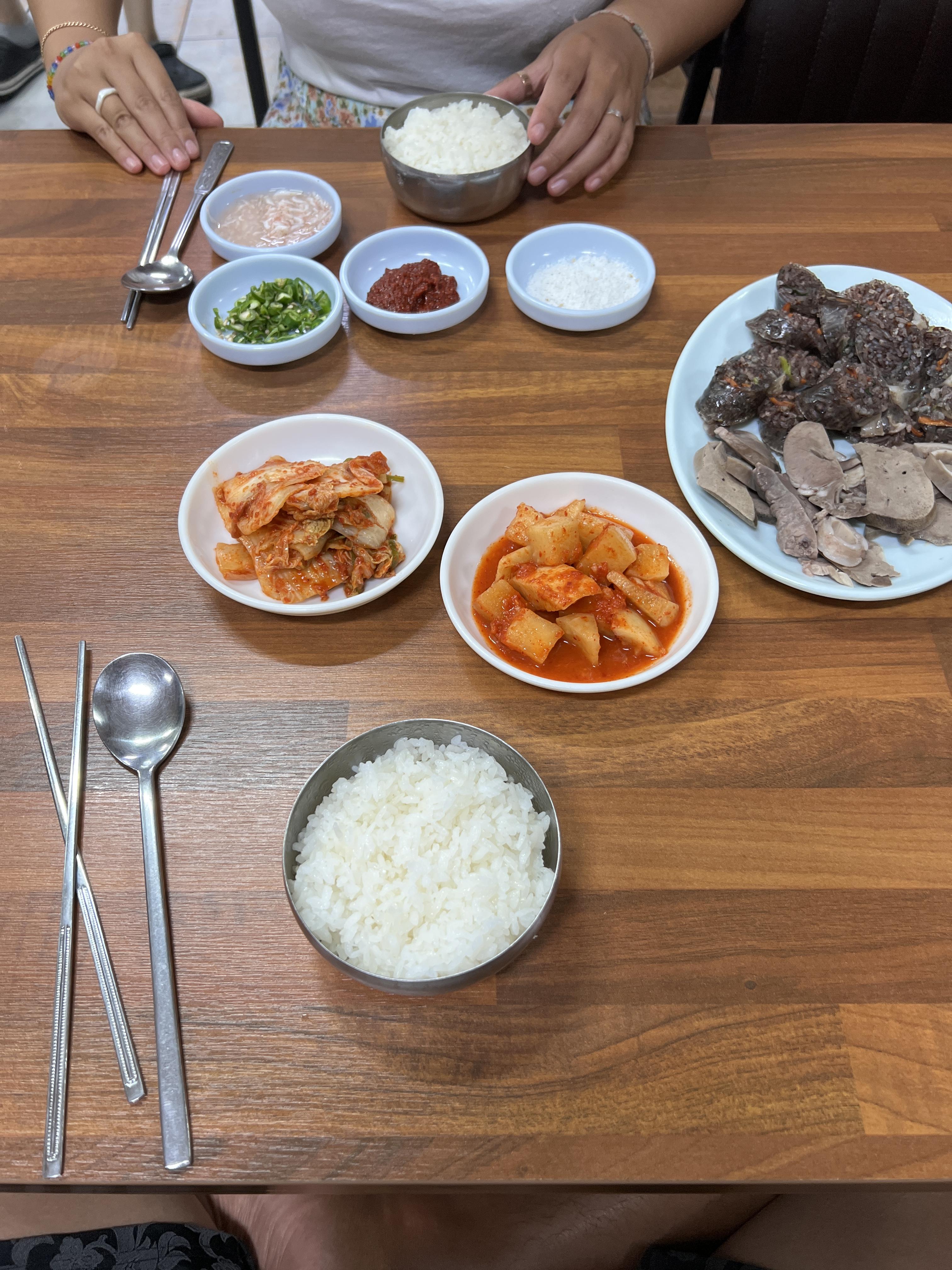 기본 밑반찬과 순대 소(5,000원)자도 하나 시켰다. 순대도 직접 만든 느낌의 순대에다 잡내가 나지않아서 좋았다. 경상도에서 나고자란 나는 순대먹을때 쌈장에 찍어먹는데 소금과 새우젓이 있어 소금에 찍어먹었는데 괜춘했음! 사람은 적응의 동물이니께