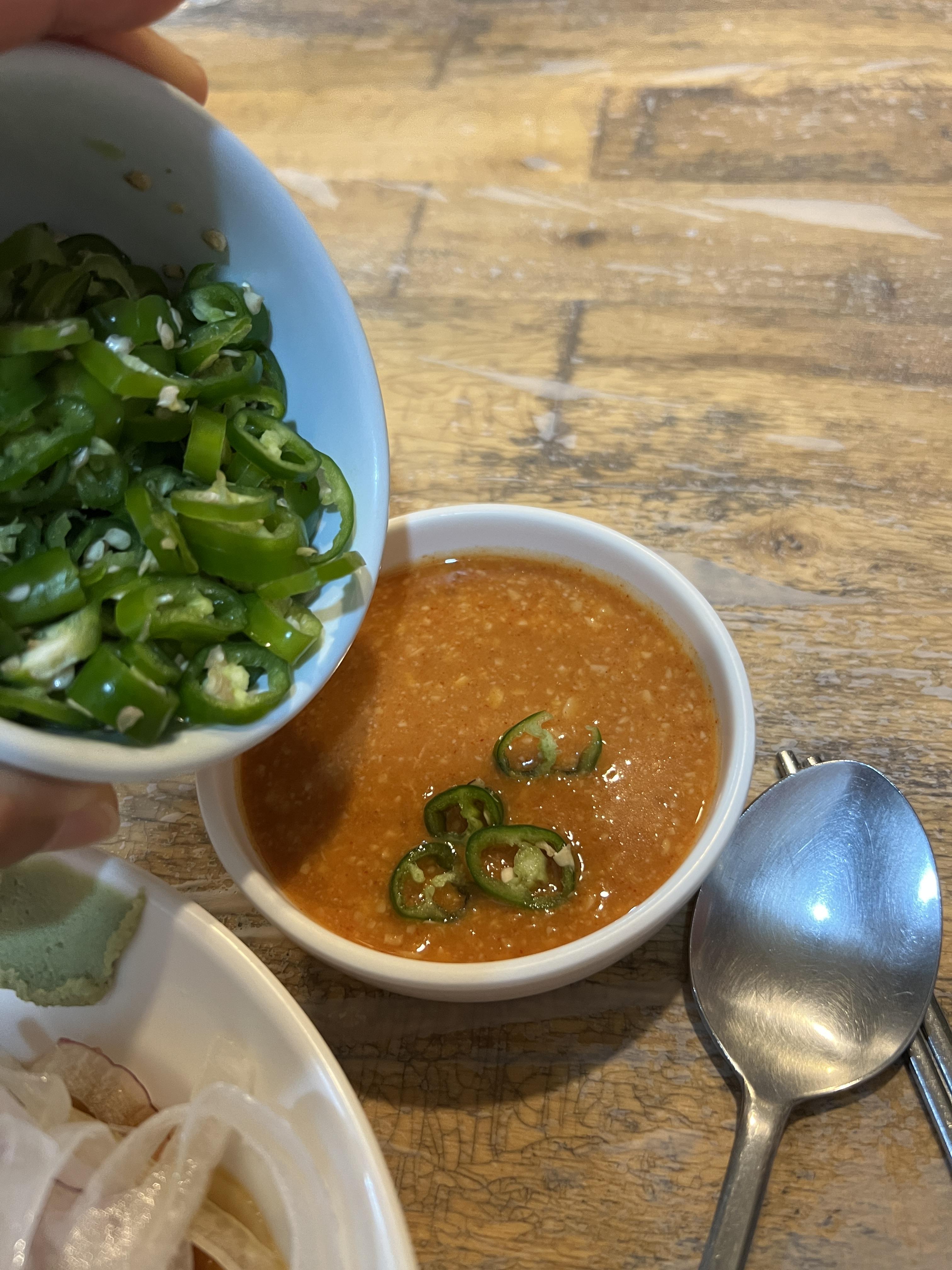 대구막창 소스! 송송 썰어놓은 매운 청양고추와 파를 듬뿍 넣어서 쉐킷쉐킷 막창먹을때 막창양념장 없음 안되지!