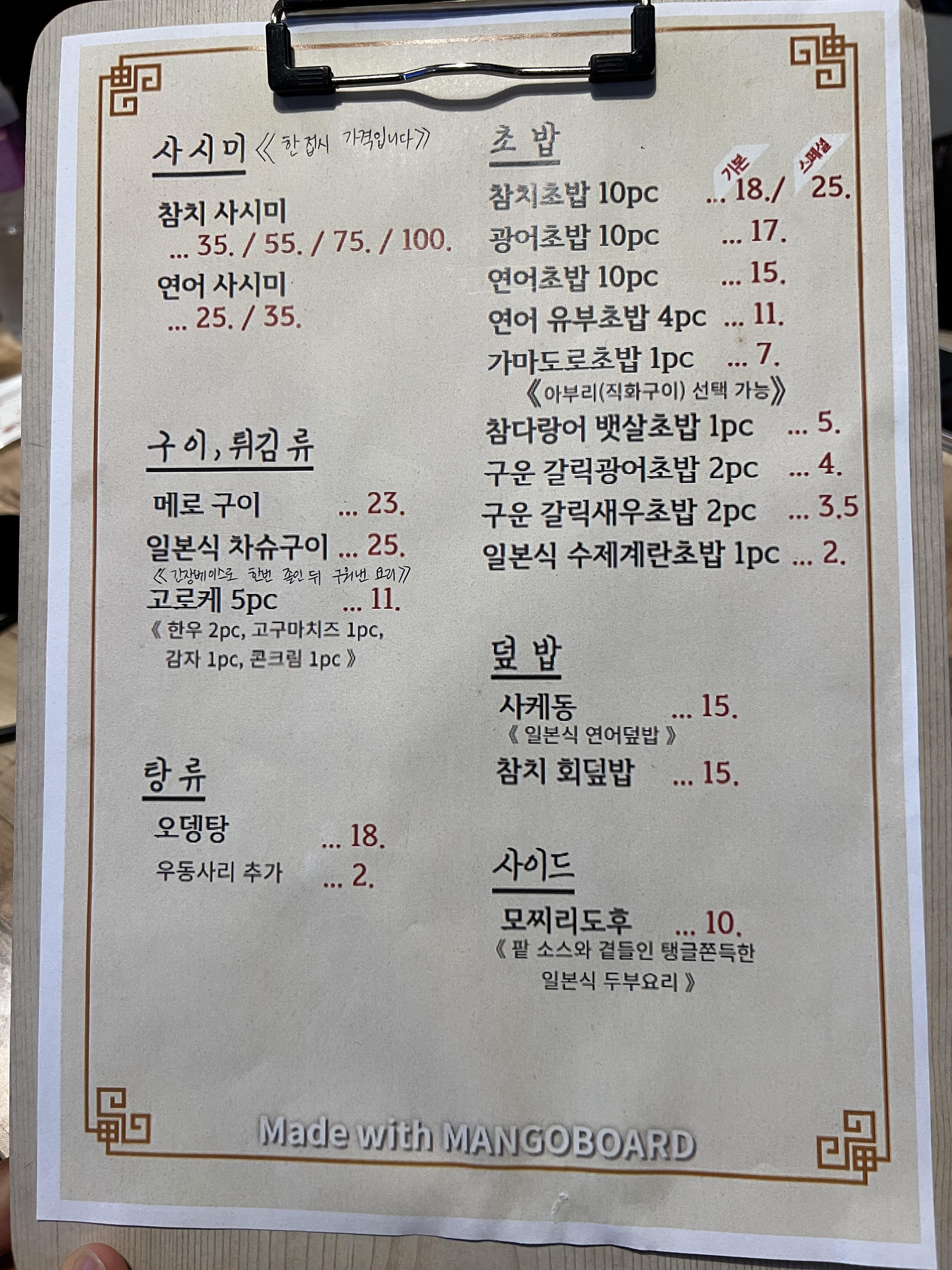 엄-청 부드러운 계란초밥과 새우초밥을 서비스로 주셨다. 계란초밥 완전 부드럽고 맛있어서 하나 먹었더니 더 먹고싶어 추가로 시키기로했는데 결국 나중에 다른걸 먹고나니 배불러서 주문을 못했다. 다음엔 계란초밥 꼭 시켜먹어야쥐,,
