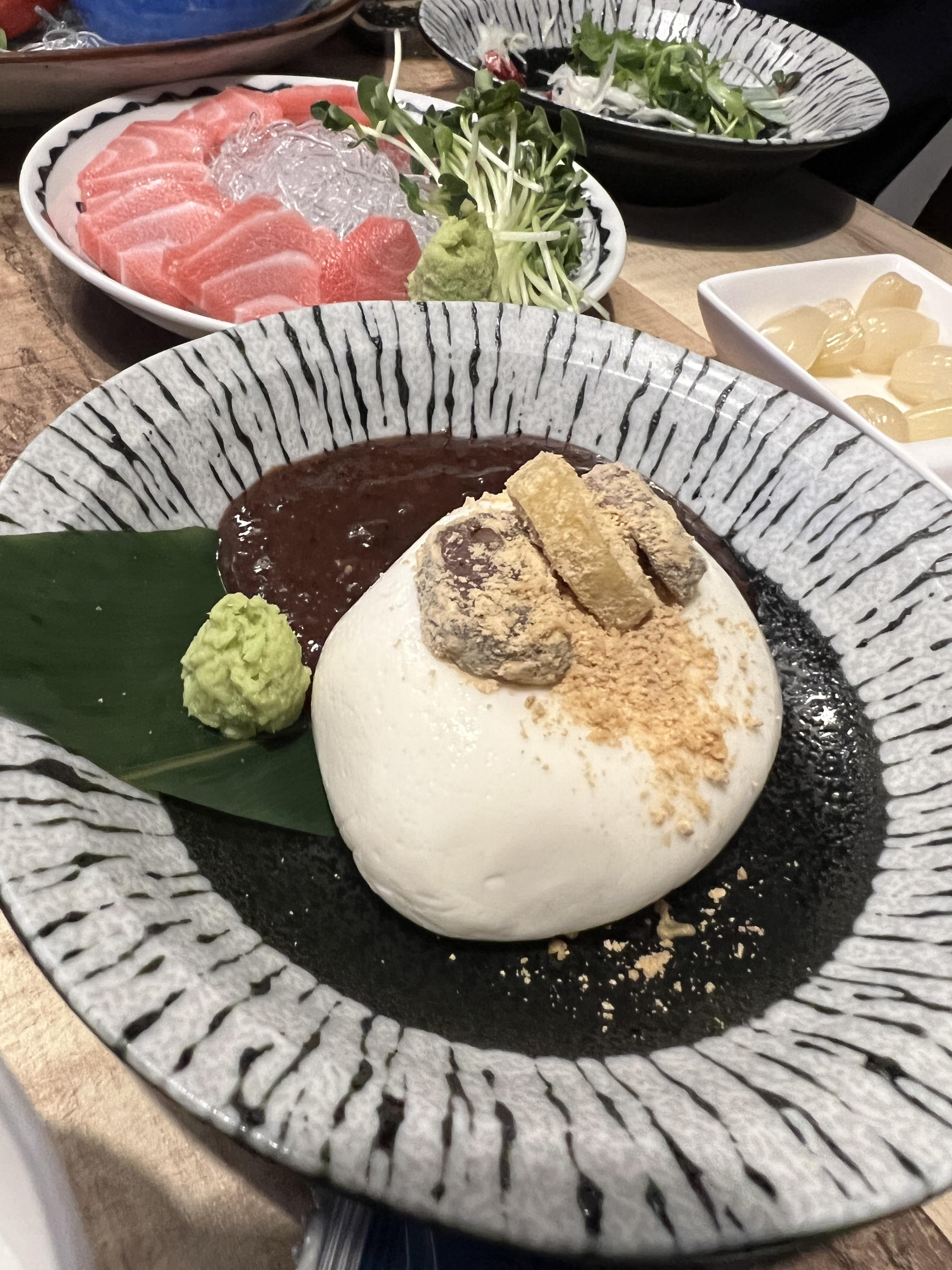 사이드메뉴로 주문한 모찌리도후! 떡처럼 쫀쫀하고 말랑말랑한 두부라는 뜻인데 다른곳에서 먹어본 모찌리도후보다 쫀쫀한 맛이 더 살아있다. 고소하고 처음에는 와사비를 넣어먹어? 이런 생각이었는데 와사비 넣어먹는게 꿀맛!