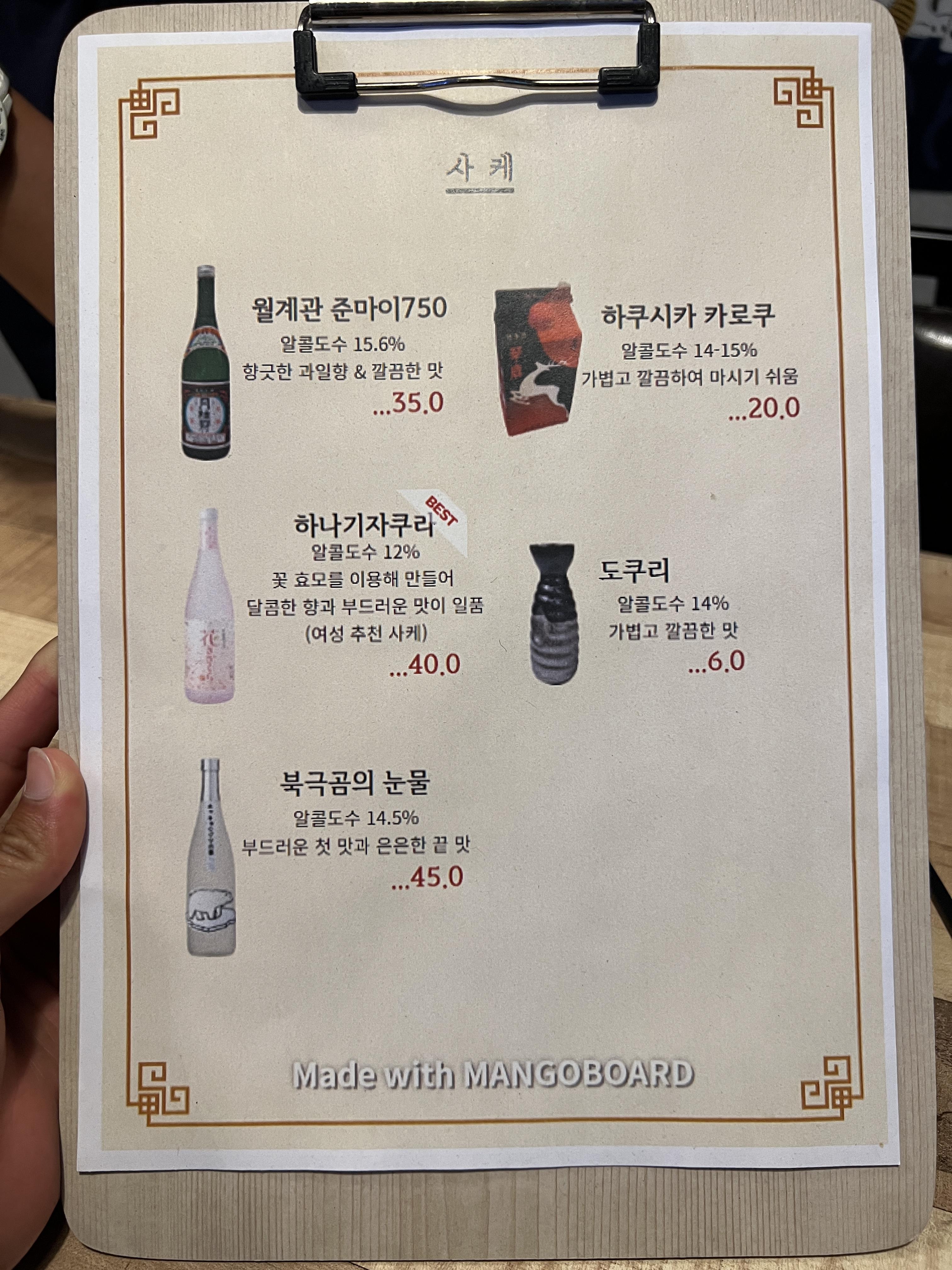 우린 참치사시미 한접시와 광어초밥, 연어초밥 그리고 모찌리도후(일본식 두부요리)까지 시킨후 하쿠시카 카로쿠라는 사케도 하나 주문했다. 사케를 접해보지 않은 분들에게 추천하는 하쿠시카 카로쿠! 메뉴판에 나와있듯이 가볍고 깔끔한 맛! 우리는 시원한 사케가아닌 온사케로 주문했다.