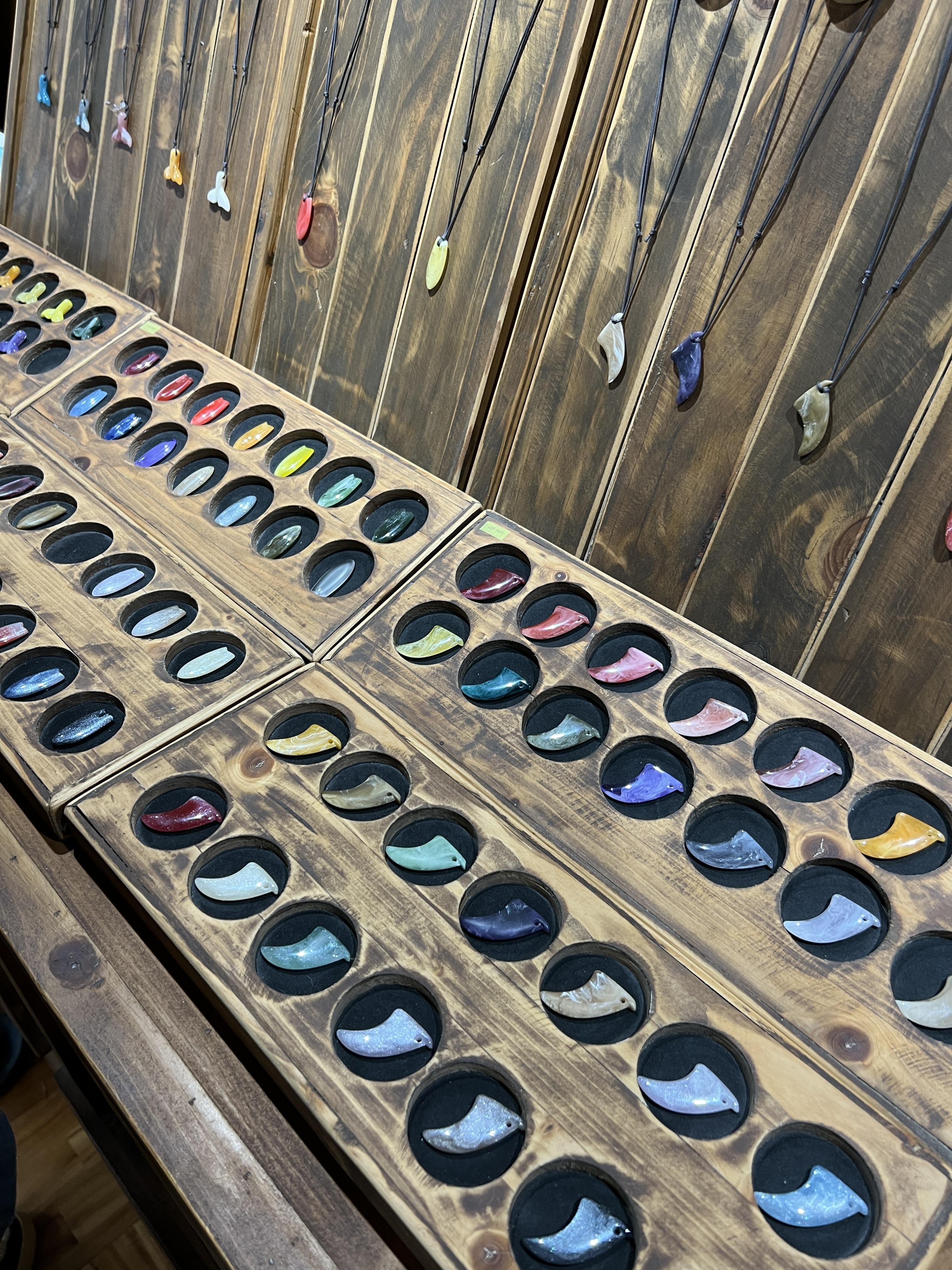 레진을 사용해 만든 고래테일, 보드, 핀등등 원하는 컬러로 목걸이를 만들 수 있다. 피부톤이 까만 나는 튀는 색상이 어울리고 어두운 색상은 잘 안보임,, 원하는 디자인을 골라서 카운터에 가져다드리면 줄 길이를 조절해서 목걸이를 만들어주심! 애견용도 가능! 줄 길이 조절해 주시니 미리 말할것!
