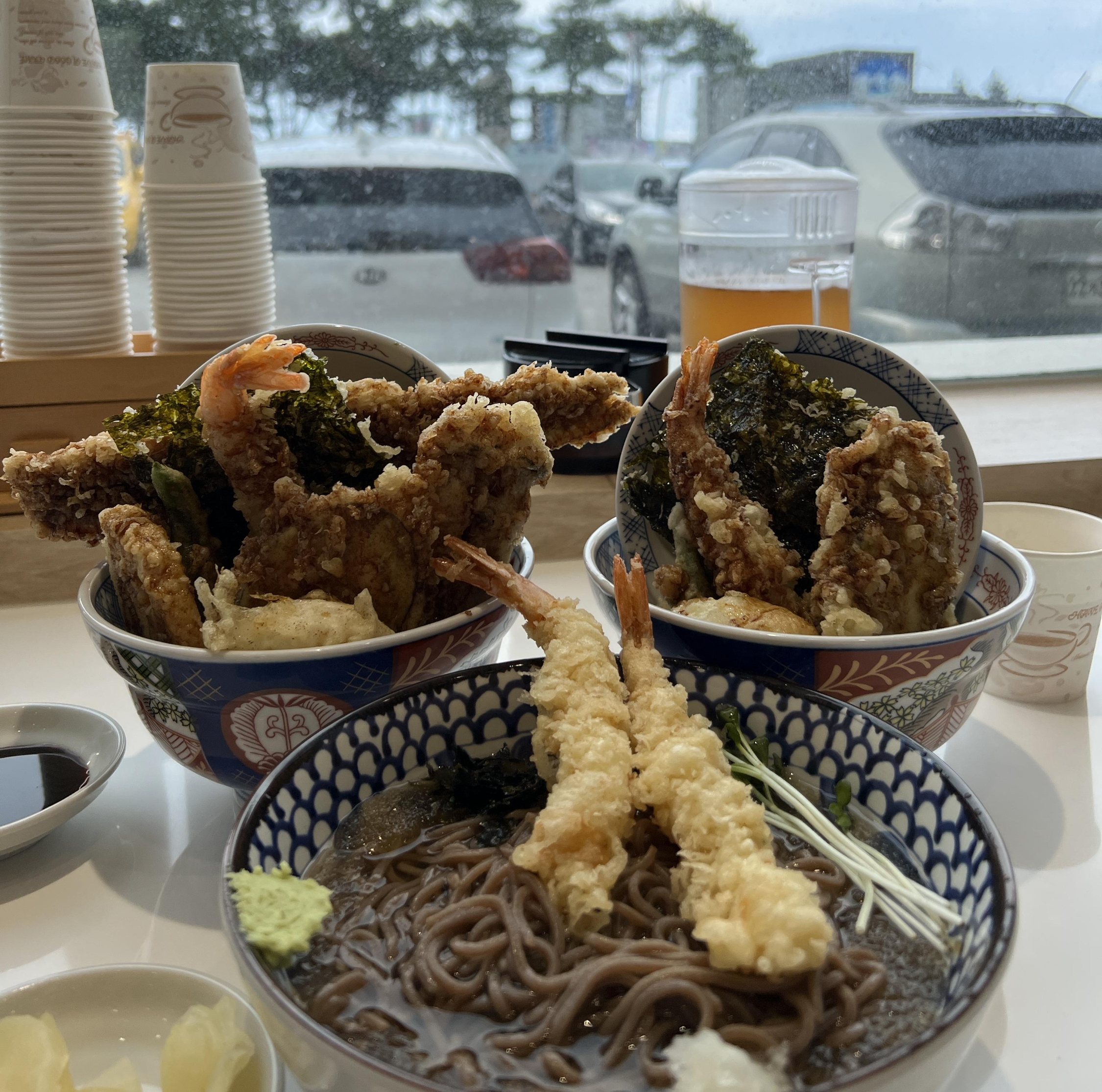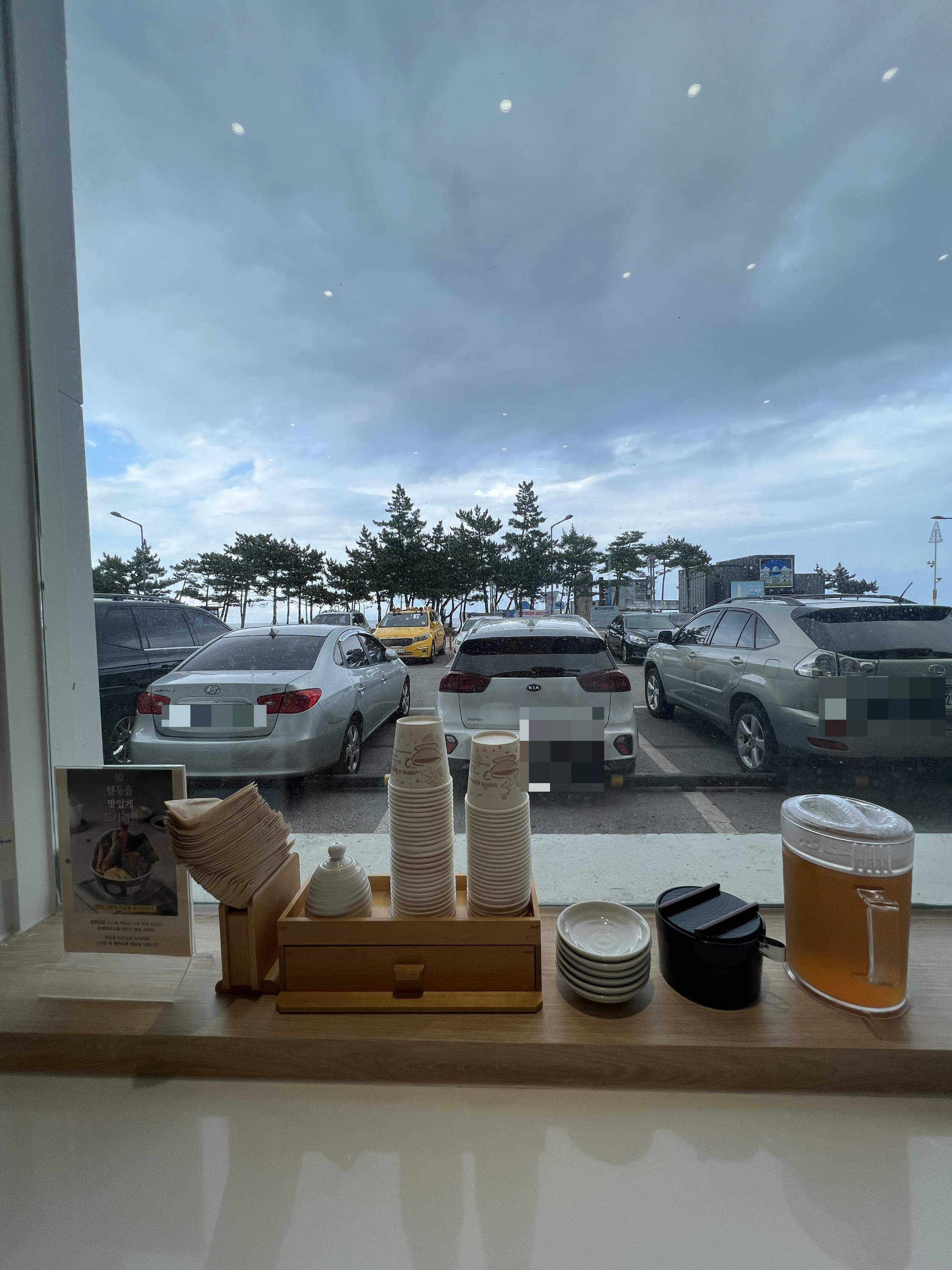 온센 텐동을 검색하면 안목해변을 바라보며 맛있는 텐동 한끼라고 적혀있지만 사실상 주차장 뷰,,