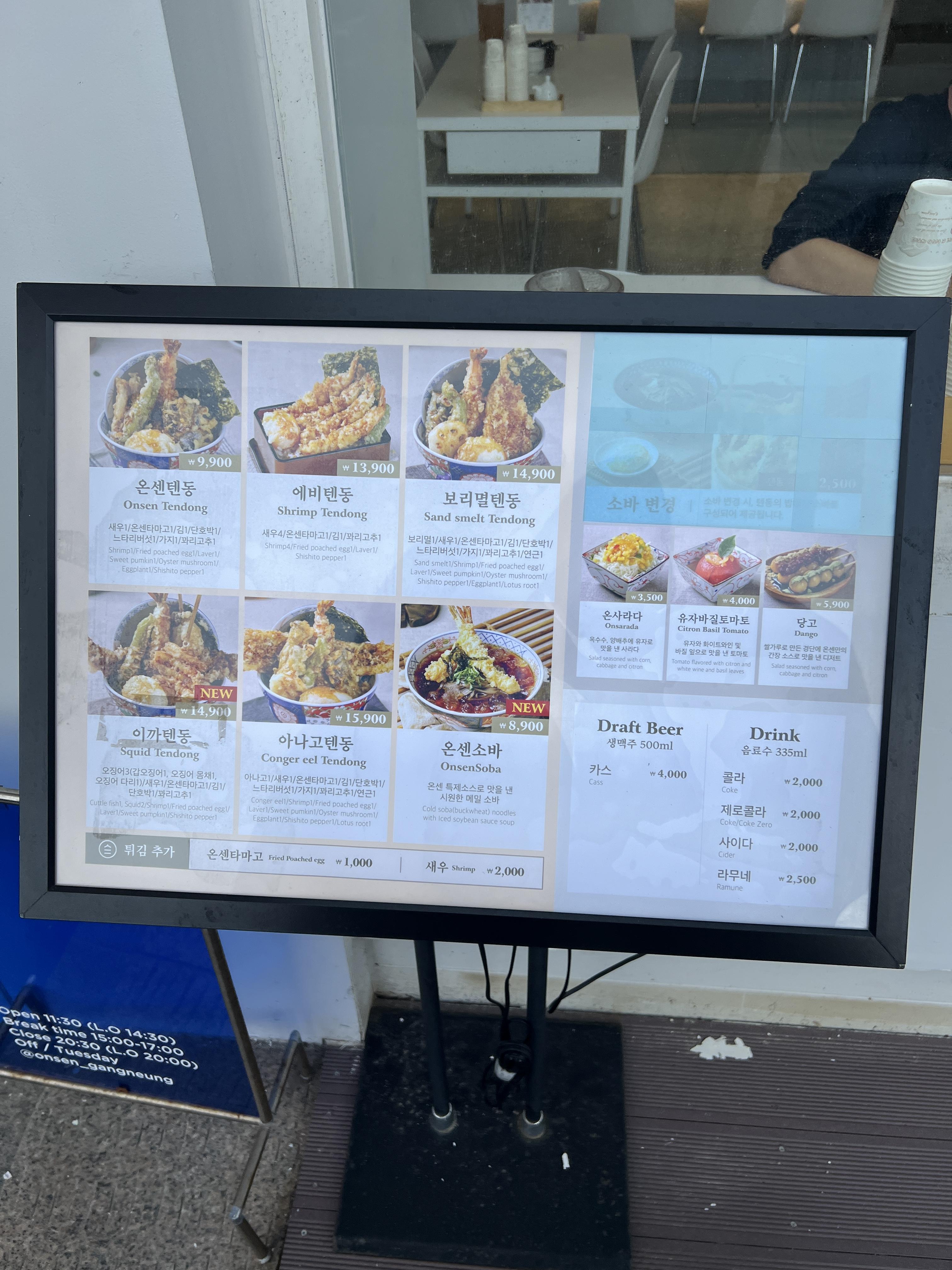 쉬는날 양양에서 강릉으로 놀러갔다가 조금 이른 저녁으로 강릉 안목해변에 위치한 온센에 텐동을 먹으러 갔다.