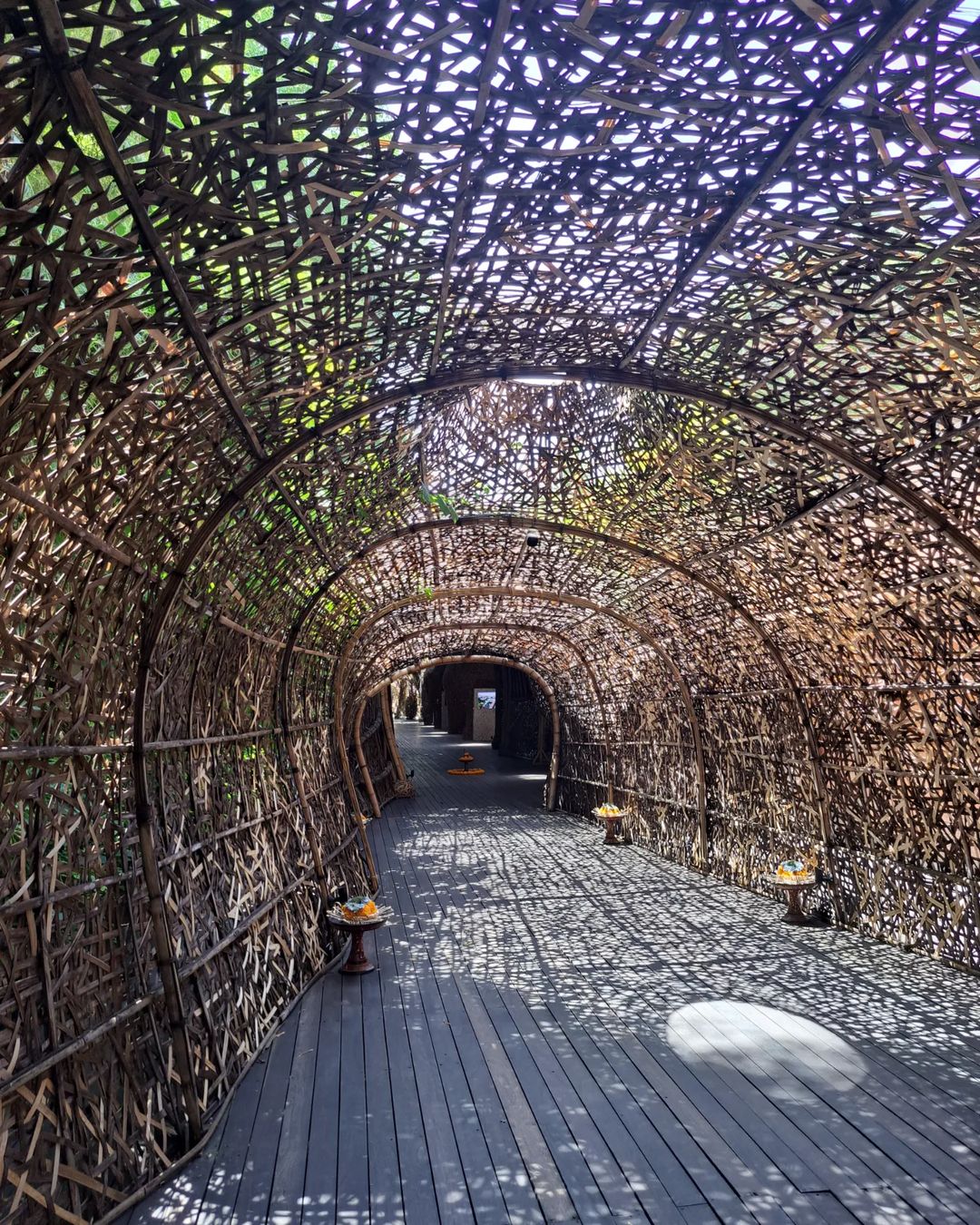 입구부터 대나무로 만든 Bamboo (대나무) 터널과 곳곳에 놓여진 차낭사리. 인도네시아에서 유일하게 힌두교를 믿는 발리 사람들은 아침부터 신에게 바치는 제물 차낭사리를 만들어 길 곳곳에 둔다. 꽃, 향, 밥풀 등으로 예쁘게 꾸며서 두는데 힌두교를 믿는 발리에서만 이러한 모습을 볼 수 있다.