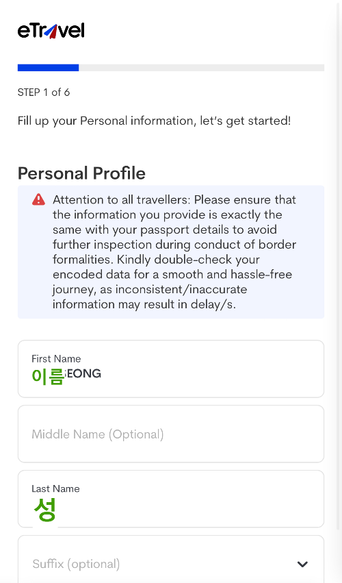 Middle name, Suffix는 선택사항 기입 안 해도 상관없다.