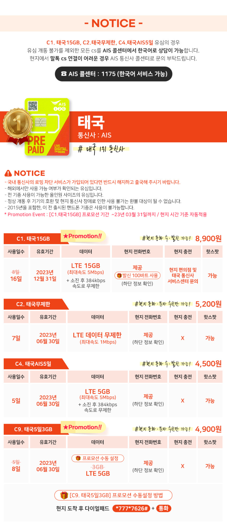 내가 선택한 태국 1위 통신사 AIS C1 태국 15GB의 경우