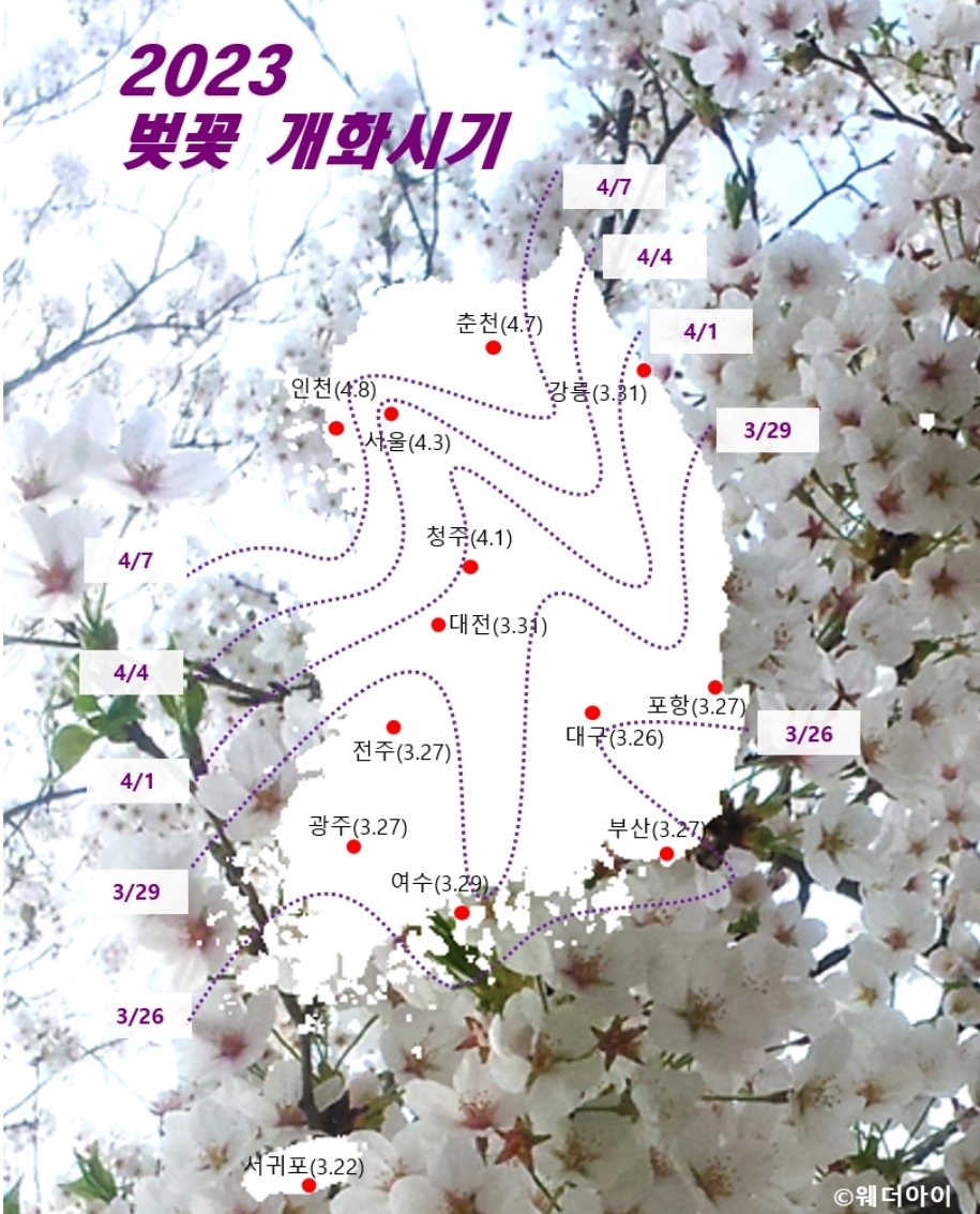 전국 벛꽃 개화시기는 웨더아이의 데이터를 통해 확인할 수 있다.