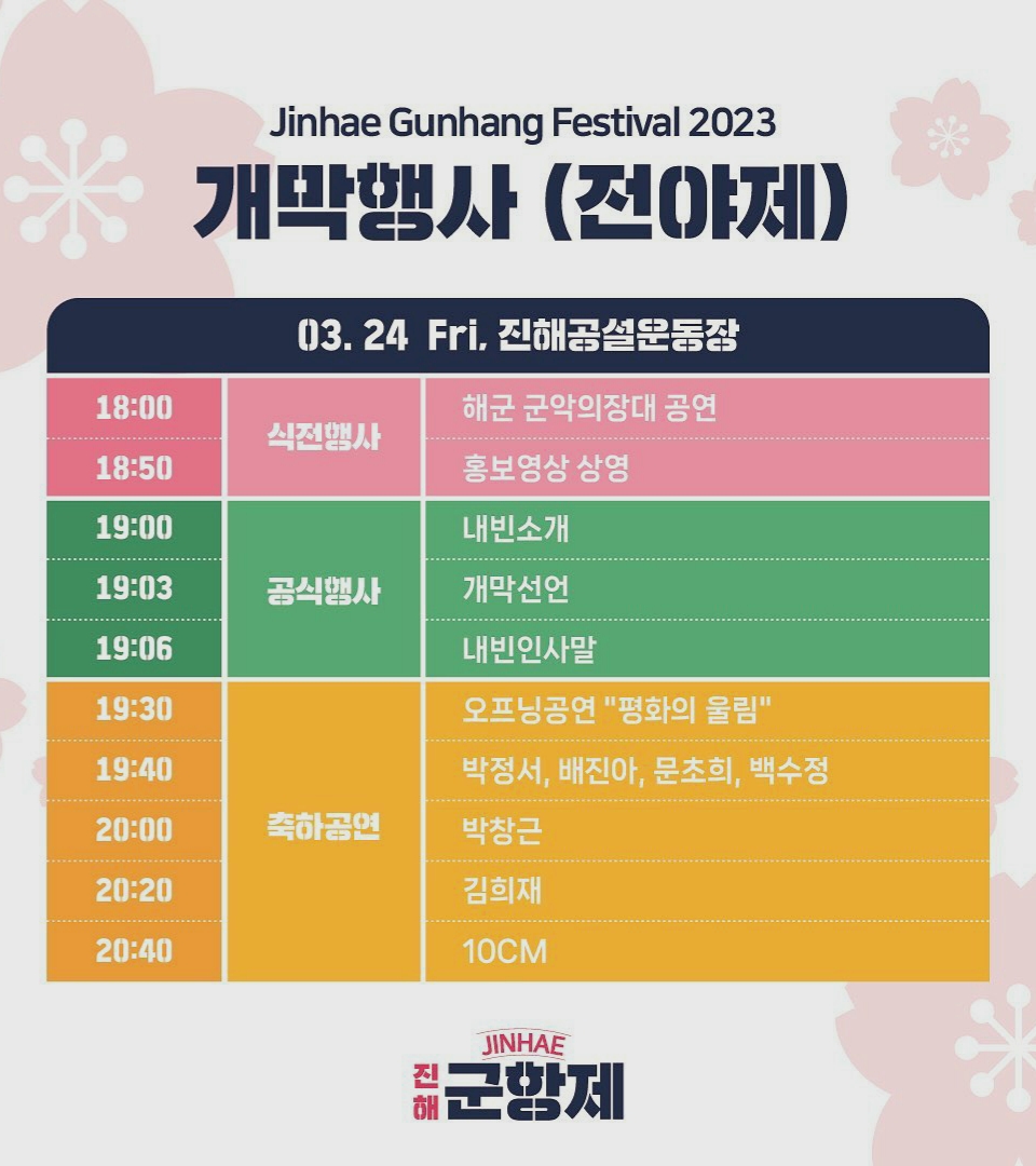 개막식 : 3월 31일 금요일 19:00 ~ 21:00 진해공설운동장