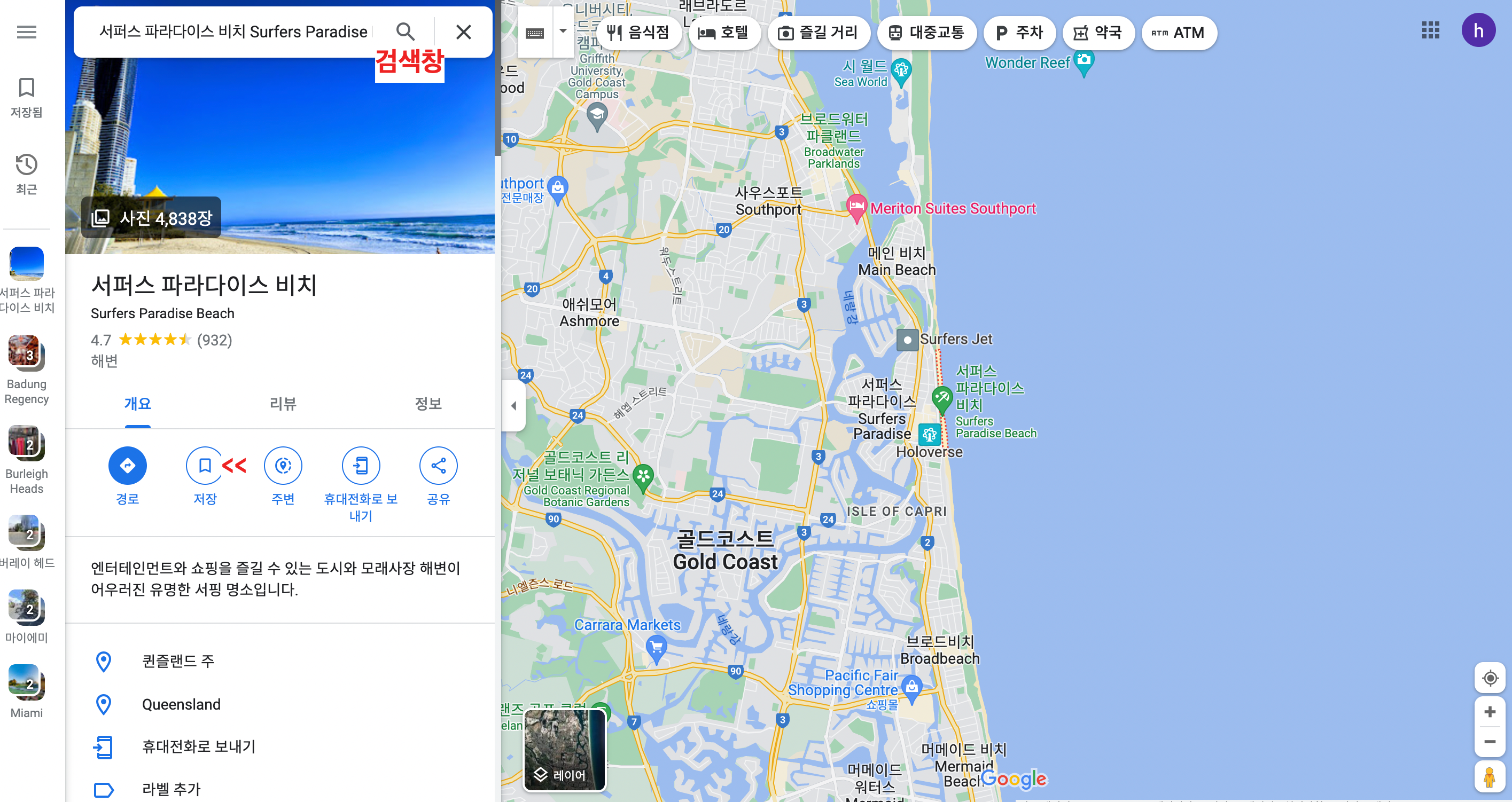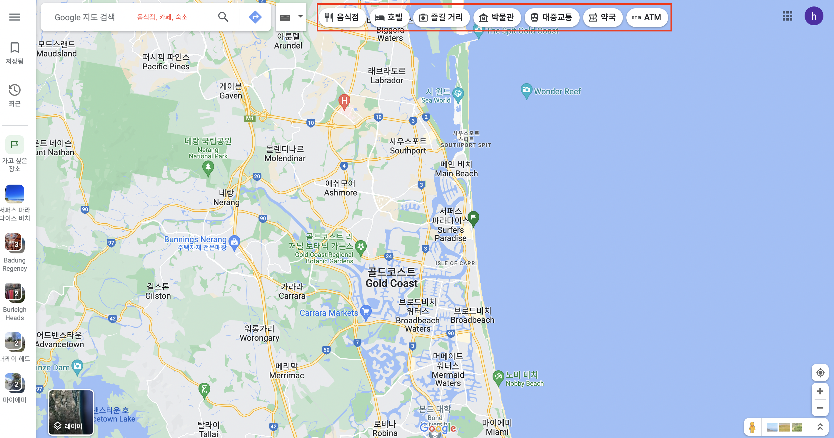 왼쪽 상단의 검색창에 관광명소, 음식점, 카페